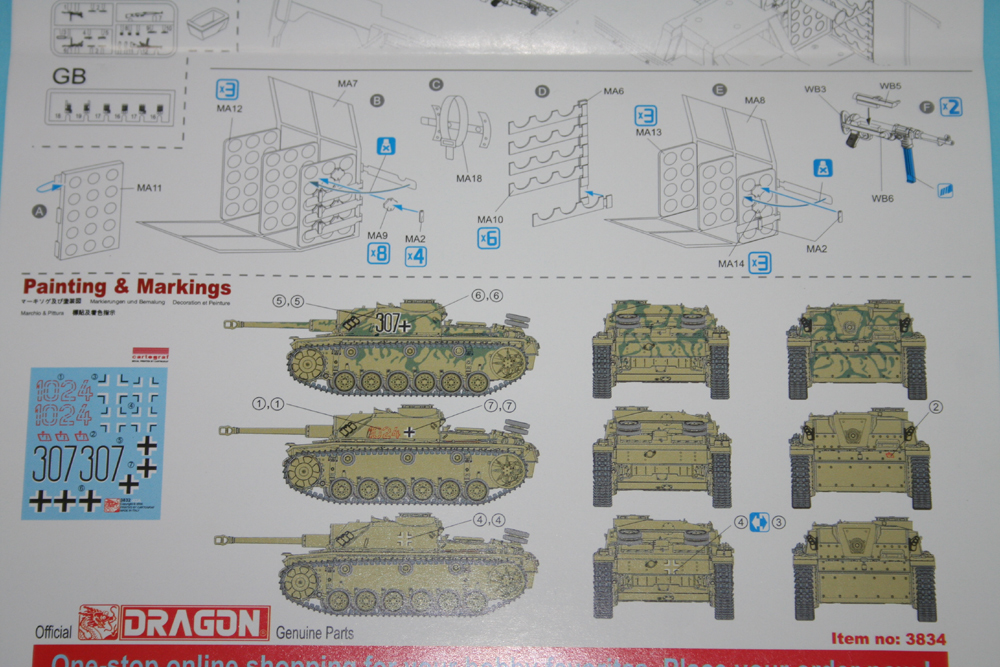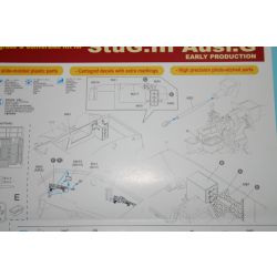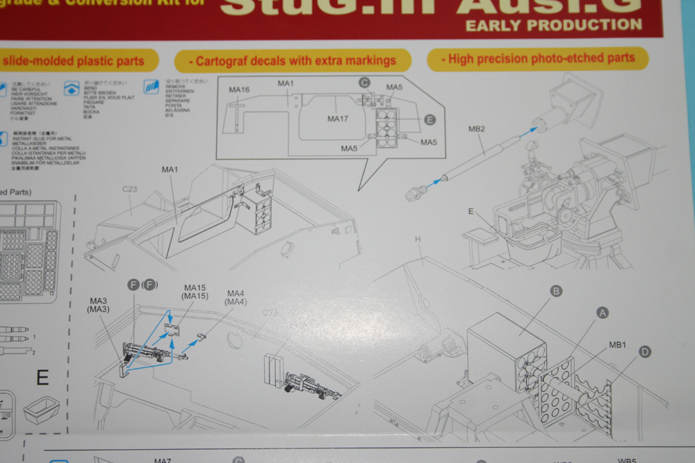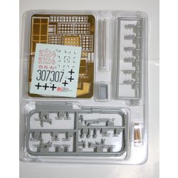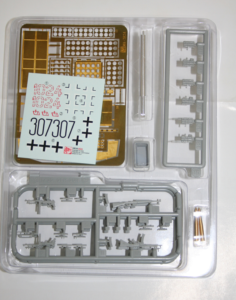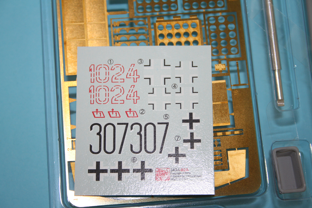 戦闘室内部に設置されている砲弾ラックや戦闘室前面内壁のエッチングパーツや金属削りだしの主砲砲身や主砲砲弾パーツをセットするほか、MP-40短機関銃、StG44(MP-44)突撃銃、ワルサーG-41自動銃も弾倉や弾倉ケースなどもプラスチックパーツでセット。さらに、カルトグラフ社製のスライドマークも入っています。