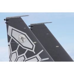 ドラゴンの鱗を機体側面や垂直尾翼などにあしらったデザインを大型のデカールシートで詳細に表現しています。コクピット左右と垂直尾翼、さらに、主翼下に装着した増槽に描かれた鱗模様がインパクト十分な仕上がりです。