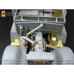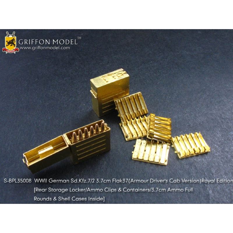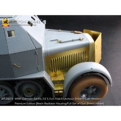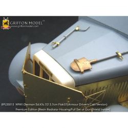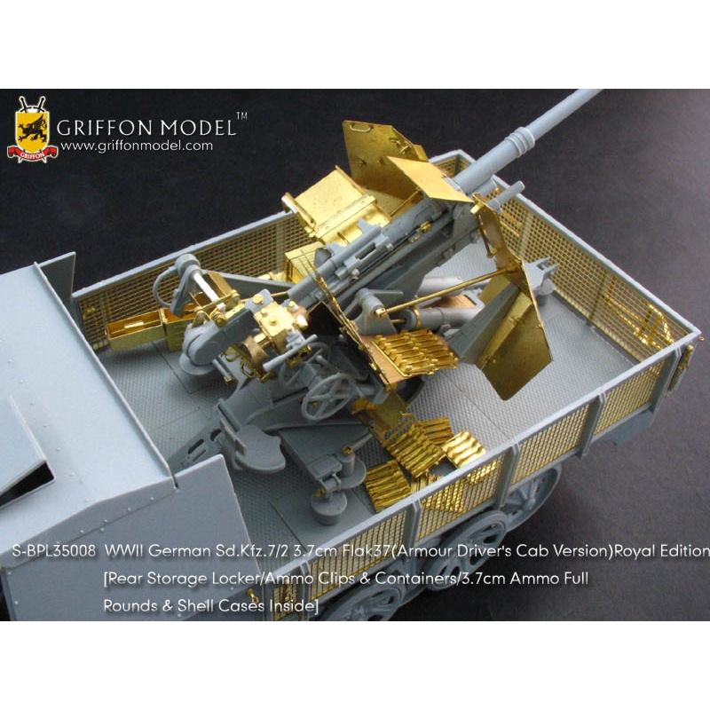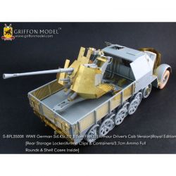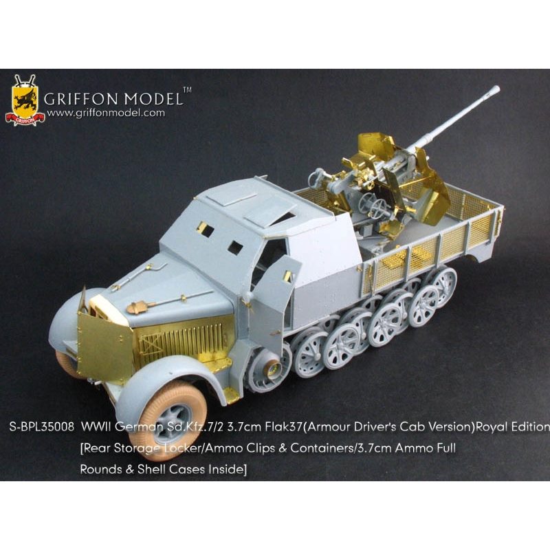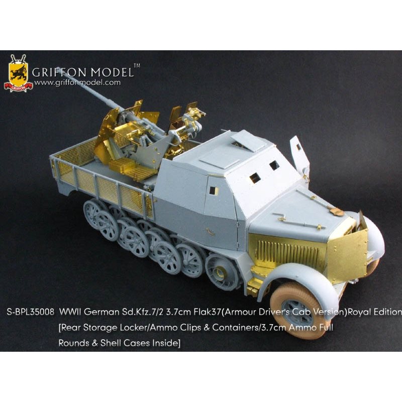 第二次大戦でドイツ軍が開発した8トンハーフトラックに3.7cm対空機関砲Flak37を搭載し、装甲キャビンを装備したSd.Kfz.7/2を再現したサイバーホビーのキットをシャープに仕上げます。セットにはディテールアップ用のエッチングパーツと金属製の砲弾、薬莢パーツ、さらに、レジン製のラジエターグリルもセットした充実仕様です。8トンハーフトラックの荷台に搭載された3.7cm対空機関砲の防盾パーツやガンナーズシールド、さらに、照準器などの細部パーツを繊細に仕上げるエッチングパーツや車体各部やエンジンルームのディテール、ボンネット前の装甲パネルやスリット入りボンネットサイドパネルなども用意。また、車載工具の止め具などの細かなディテールパーツもセットされています。セットには詳しい説明書もついて、確実なディテールアップをお楽しみいただけます。プラスチックパーツとは違ったシャープなディテールがリアリティあふれる1ランク上の完成品を仕上げていただけるセットです。ベテランモデラーにはぜひ、利用していただきたいセットです。