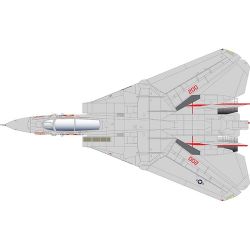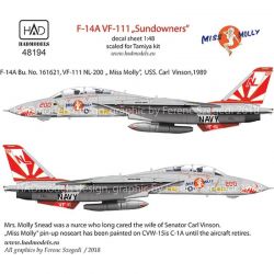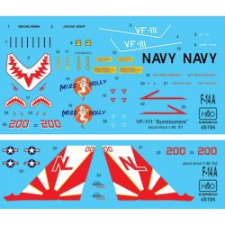 このセットは人気のアメリカ海軍F-14AトムキャットのVF-111サンダウナーズのマーキングからフィーチャー。サンダウナーズの人気のマーキング、尾翼に描かれた日章旗のマーキングをしっかりと再現します。中でも1989年の空母カールビンソンにに搭載されていたNL-200機のマーキングを再現。コクピット横に描かれたピンナップガールのイラスト、Miss Mollyをはじめ、ノーズのシャークマウスもしっかりと用意しています。トムキャットファンには見逃せない機体のマーキングです。