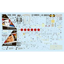 小松が舞台の歌舞伎「勧進帳」の登場人物、弁慶と義経や富樫左衛門をモチーフにしたイラストを垂直尾翼にあしらったデザインを大型のデカールシートで詳細に表現しています。デカール印刷はカルトグラフが担当したシルクスクリーン印刷デカール。色透けが少なく発色が良いイタリア製のデカールです。
