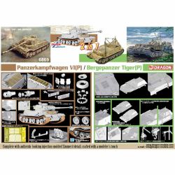 モデルは1/35スケールでPz.Kpfw.VI(P) ポルシェティーガー、あるいは戦車回収車タイプ ベルゲパンター・ティーガーのどちらか選んで組み立てられるプラスチックモデルキットが2 in1で登場です。ポルシェティーガーは車体、砲塔に磁気吸着地雷除けのツィメリットコーティングを施した状態のパーツを用意。