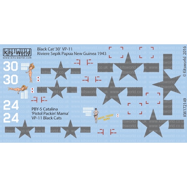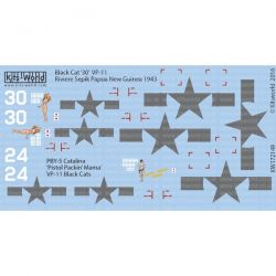 このセットではパプアニューギニアに展開したアメリカ軍の哨戒爆破部隊、VP-11の機体から「ピストル・パッキン・ママ」のマーキング、さらに、カタリナ30の機体のマーキングをセレクトして収録しています。女性のイラストを描いたノーズアートやもちろん国籍マークもセット。カラフルな仕上がりが楽しみなマークです。