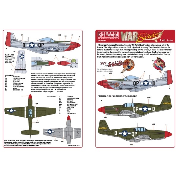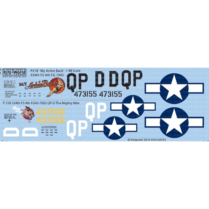 このセットではヨーロッパ戦線で活躍した第4ファイターグループ・第334戦闘飛行隊所属の「マイ・エイチン・バック」と、同じく第4軍の第334戦闘飛行隊所属の「ザ・マイティ・マイト」の2つの機体のマーキングを収録しています。女性の魅力的なイラストの「マイ・エイチン・バック」とコミカルな大男のイラストの「ザ・マイティ・マイト」はどちらもカラフルな仕上がりが楽しみなマーキングです。このセットはレベルとトランぺッターのキットに対応しています。