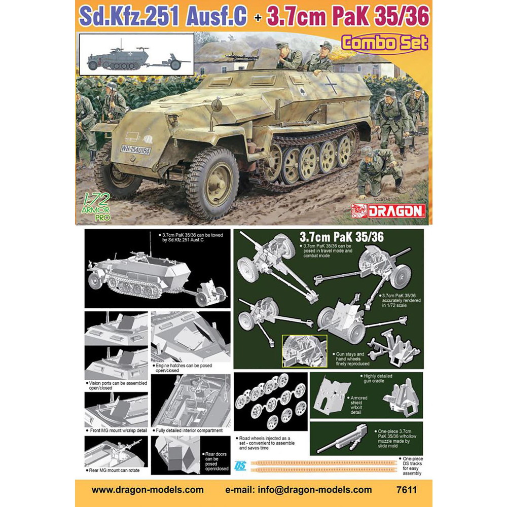 第二次大戦で幅広くドイツ軍が使用した装甲兵員輸送車Sd.Kfz.251とそれが牽引することが多かった対戦車砲3.7cmPaK35/36を1/72スケールで再現したプラスチックモデル組み立てキットです。
