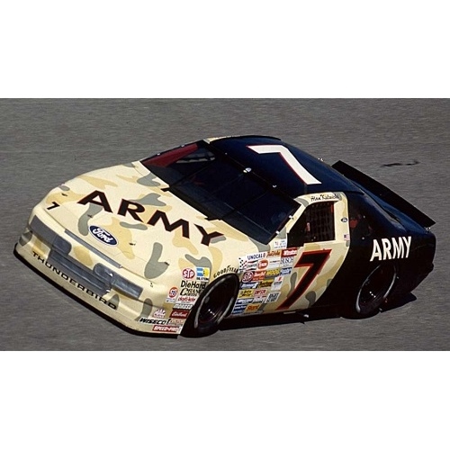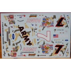 このデカールではNASCARレースの中でも最も人気の高いレースの一つ、デイトナ500の1991年のレースに参戦したアラン・カルウィッキのマシンのマーキングを収録しています。アメリカ陸軍がスポンサーになっているマシンでレースの時には迷彩塗装のカラーリングが施されていました。そのカラーリングに合わせたマーキングが再現されています。ベースキットにはモノグラムからリリースされている1/25の1989-93フォード・サンダーバードのキットを使用して仕上げてください。迷彩柄やスポンサーロゴ、ステッカー類のマーキングがセットされています。