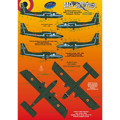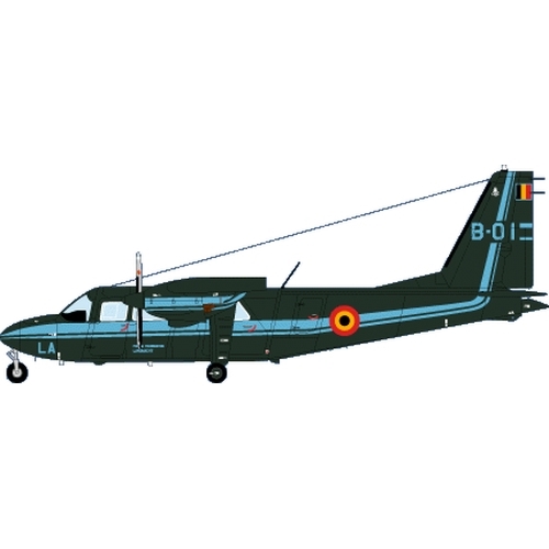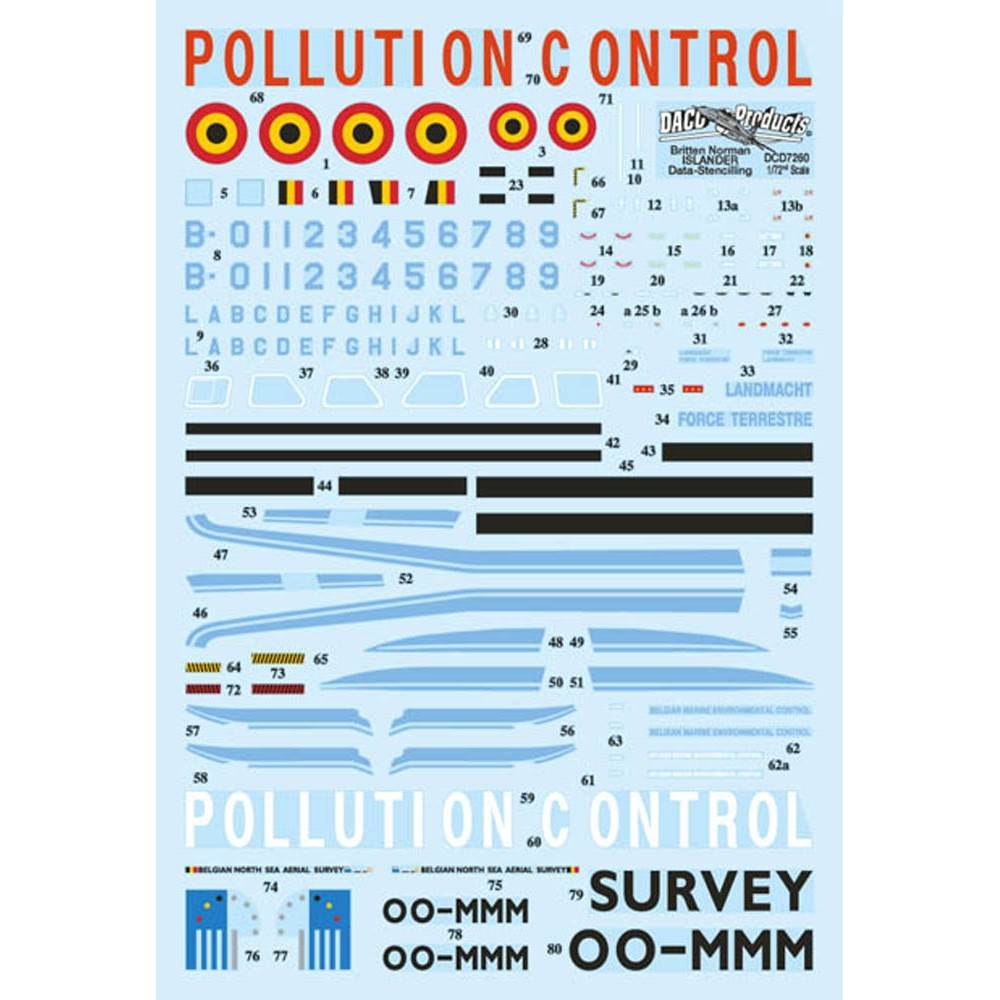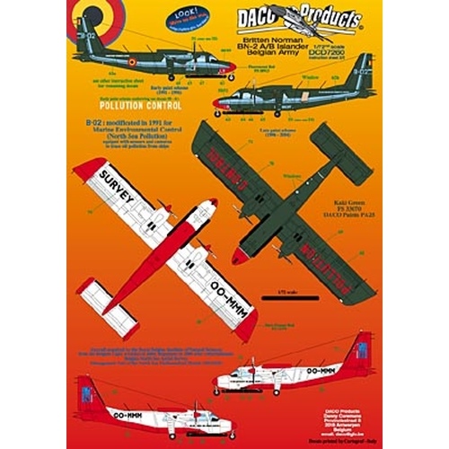 このセットではイギリスのブリテンノーマン社が1965年から製造する高翼の汎用機、アイランダーに対応したマークを収録したデカールセットです。収録されているのはベルギー陸軍が連絡用航空機として運用している機体のマーキングです。陸軍運用機のほかに、ポリューション・コントロール・サーベイ(公害防止調査のプラットフォーム機として民間灯篭されている機体のマーキングも収録されています。