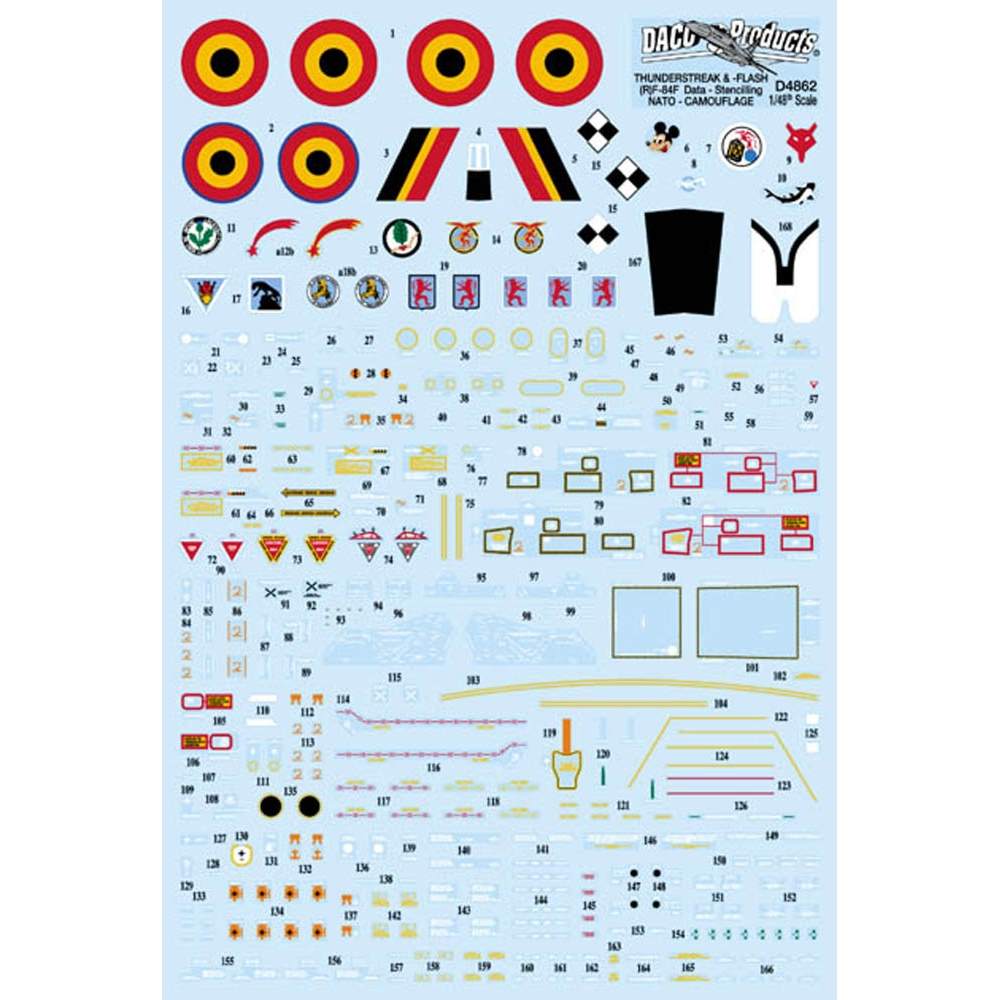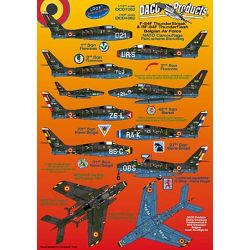 このセットではベルギー空軍が配備していたジェット戦闘機、F-84Fサンダーストリーク、サンダーフラッシュの機体に描かれたステンシル類を収録しています。ベルギー-も参加するNATO、北大西洋条約機構軍のカモフラージュ塗装を施された機体に合わせたカラーで各ステンシルを再現。1/72スケールのF-84Fサンダーストリーク、サンダーフラッシュをベルギー空軍仕様に仕上げるモデラーに欠かせないデカールセットです。