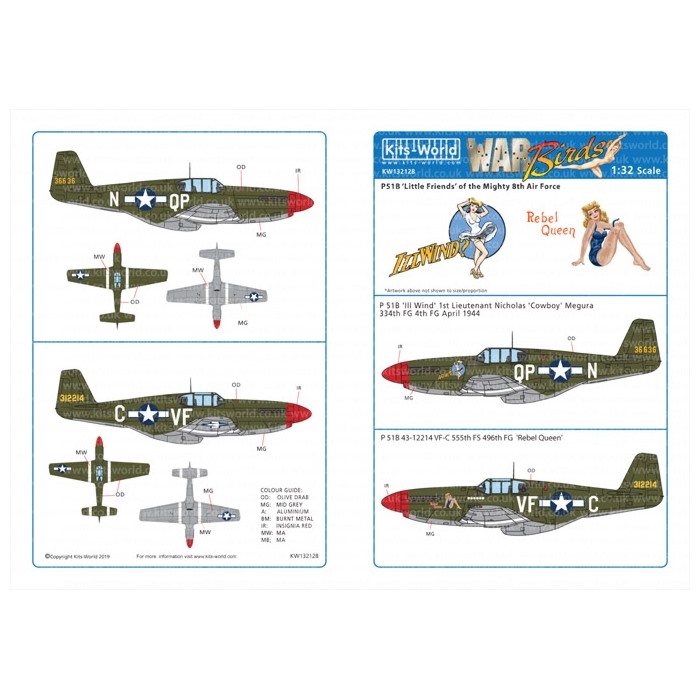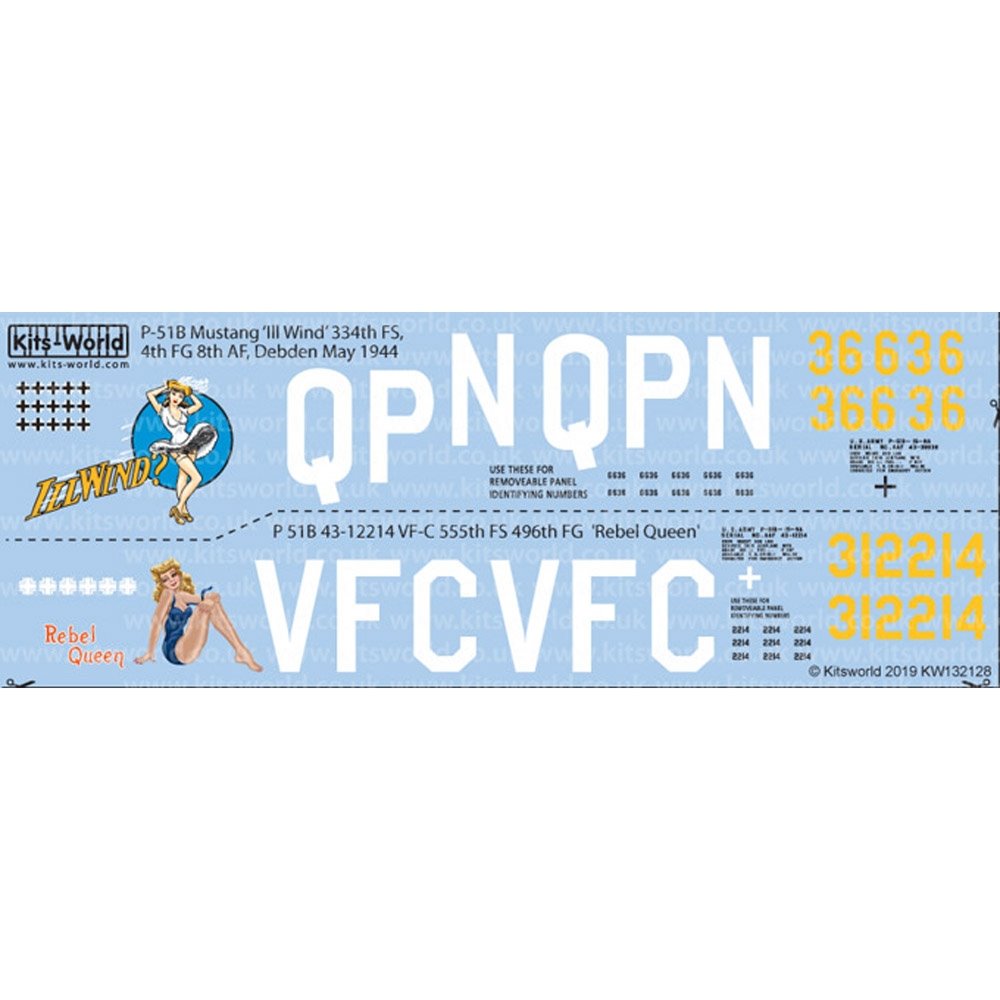 このセットではヨーロッパ戦線でイギリス空軍の後を受けて活躍した第4ファイターグループ第334戦闘飛行隊に所属するIll Wind 機と第496ファイターグループ第555戦闘飛行隊に所属するRebel Queen 機の2つの機体のマーキングを収録しています。どちらもピンナップガールのイラストニークなイラストや撃墜マークなど再現され、カラフルな仕上がりが楽しみなマークです。