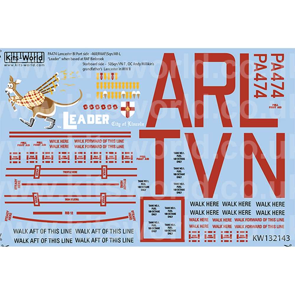 第二次大戦でイギリス空軍が配備運用した大型爆撃機、アブロ・ランカスターの1/32スケールモデルに対応したデカールのセットです。