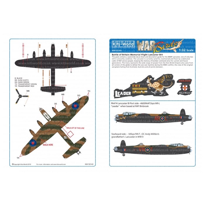 このセットでは現在も飛行可能な機体の一つとされるアブロ・ランカスターの機体のマーキングを収録しています。イギリスの工場で採算された機体で戦後は博物館に展示、保管されていました。このマーキングは1973年に行われたバトル・オブ・ブリテンのメモリアルフライトでのマーキングを再現しています。