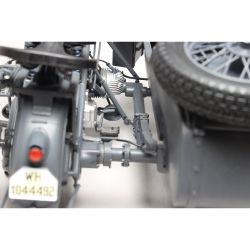 フレームやエンジンをはじめとする細部のメカニズムに至るまで詳細にモデル化しています。プレスフレームを採用した車体構造をはじめ、シャフトドライブの駆動系、サイドカーの車輪に動力を伝えるシャフトなどもしっかりと再現。
