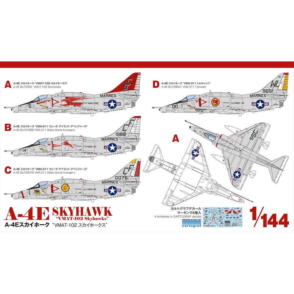 This is an unpainted assembly plastic model kit for A-4E SKY HAWK “VMAT-102 SKY HAWKS” in 1/144 scale.