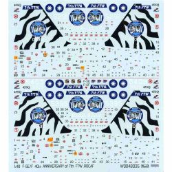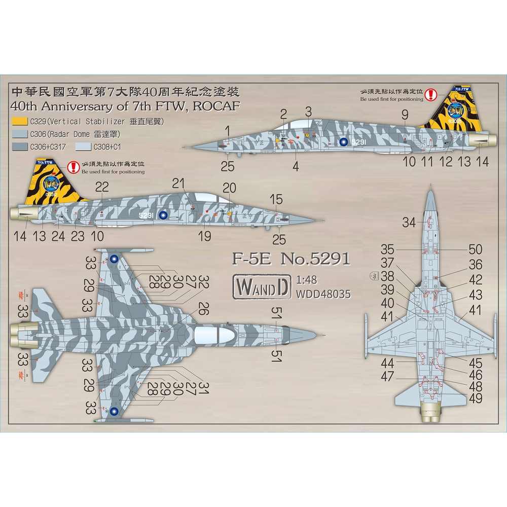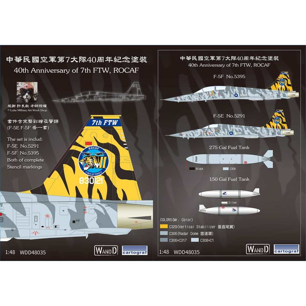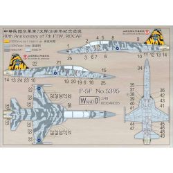 このセットでは現在、台湾の中華民国空軍が配備運用するF-5E/Fのマーキングを再現するデカールを収録したセットです。中華民国空軍の第7大隊の40周年を記念して施された特別塗装機のマーキングを再現しています。尾翼に描かれた記念マークとタイガーのシマ模様をセット。