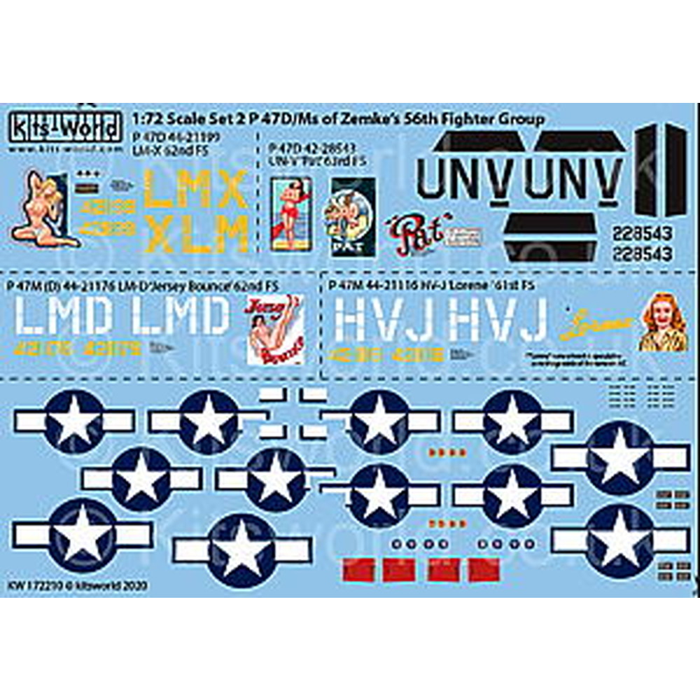 第二次大戦でアメリカが配備運用した大型の戦闘機、リパブリックP-47サンダーボルト・バブルトップの1/72スケールモデルに対応したデカールのセットです。