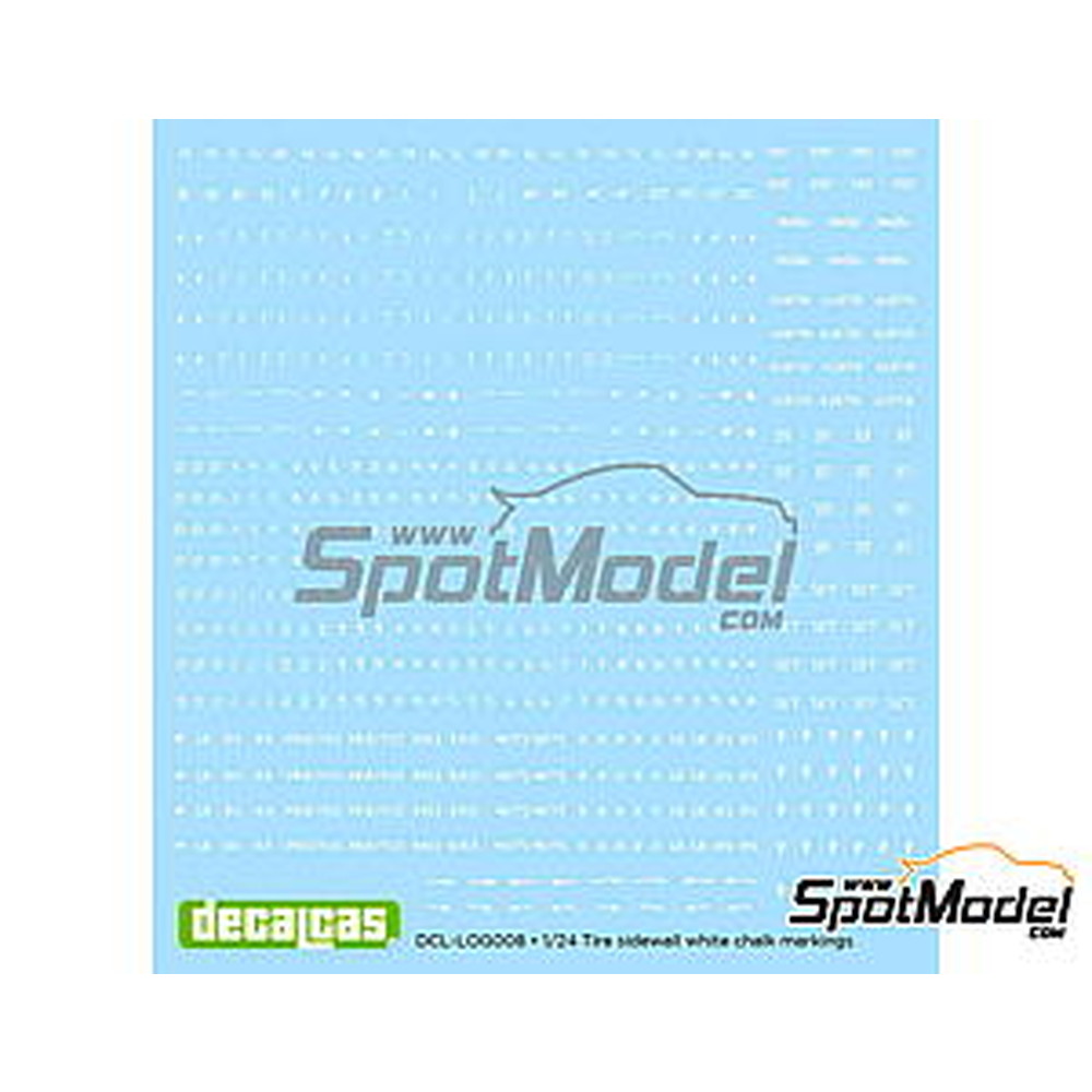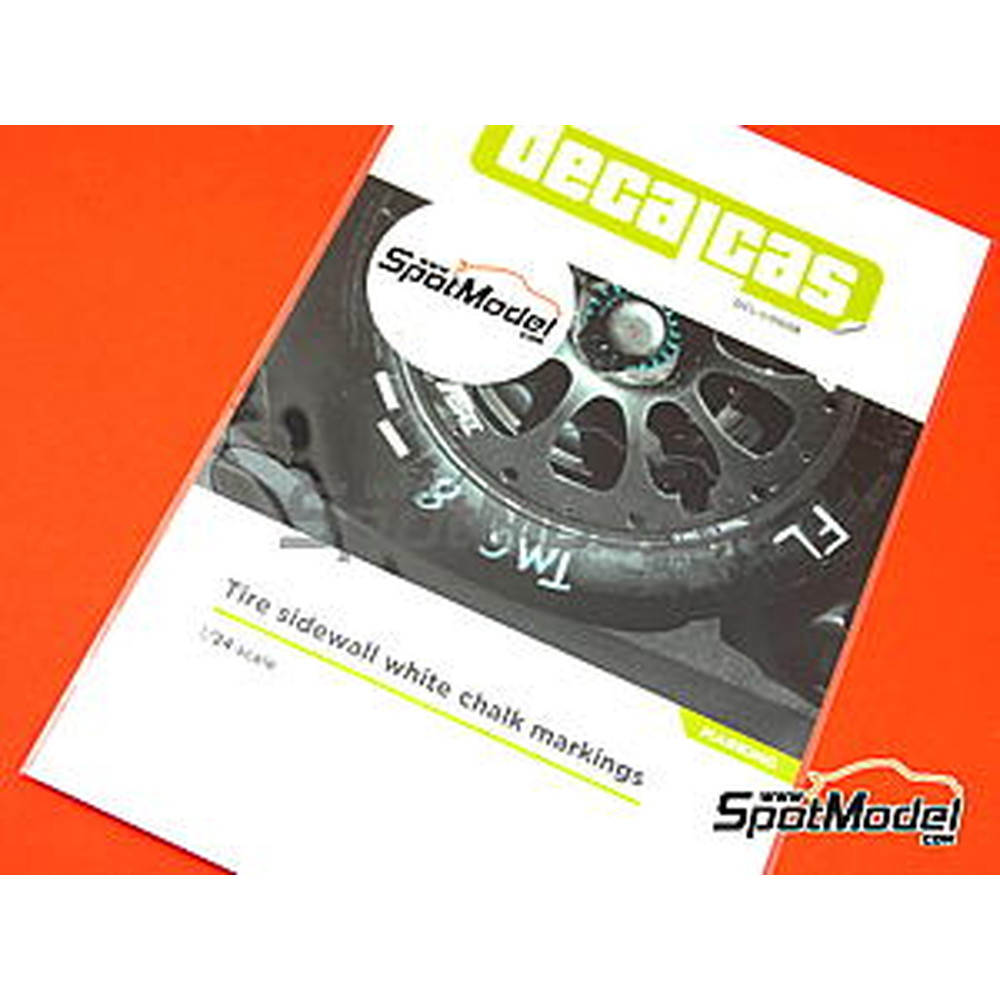 このデカールセットではそうしたレーシングカーのタイヤのサイドウォールに手書きされるサインを再現しています。中でもホワイトのチョークを使ったマーキングをセレクト。数字やアルファベット、あるいはタイヤの回転方向を示す矢印など、豊富にセットされています。