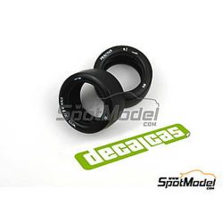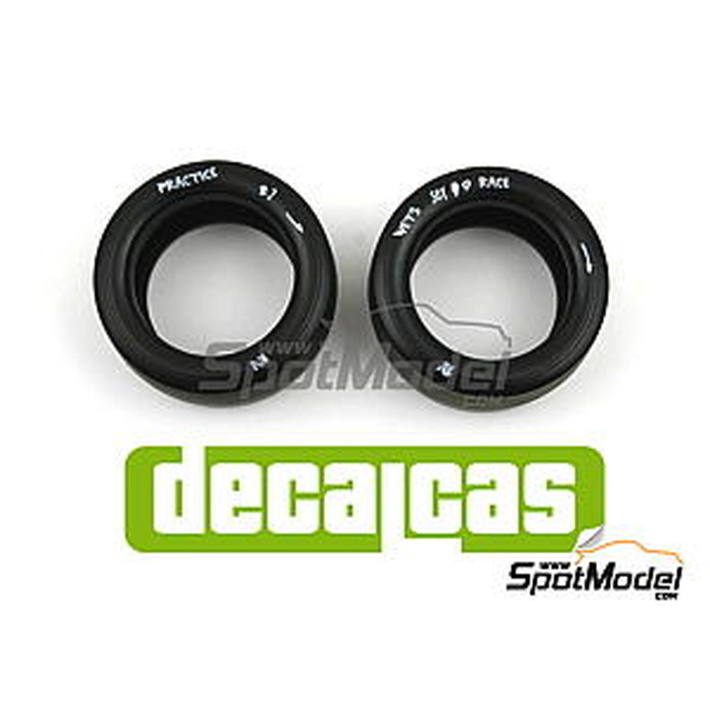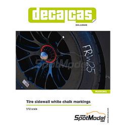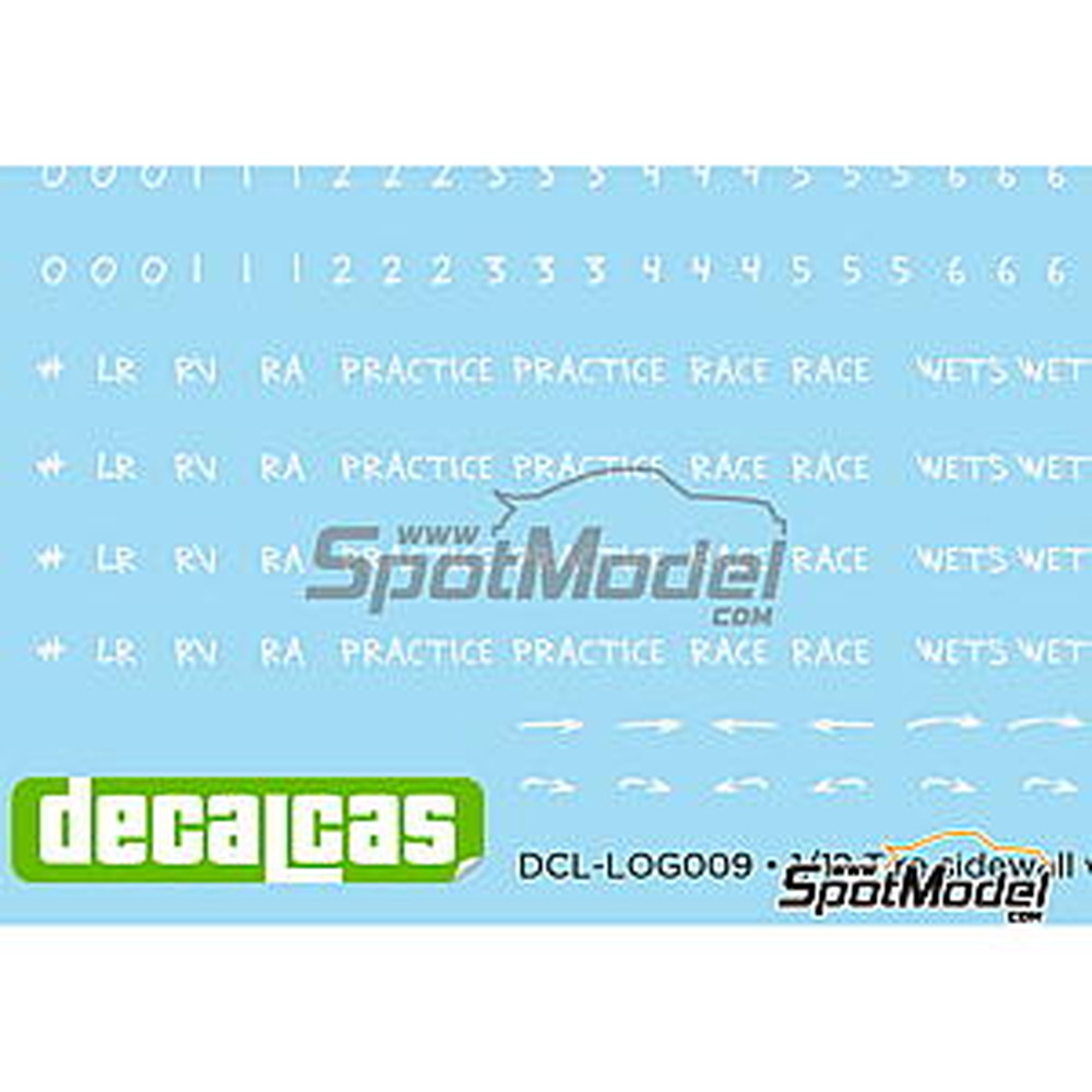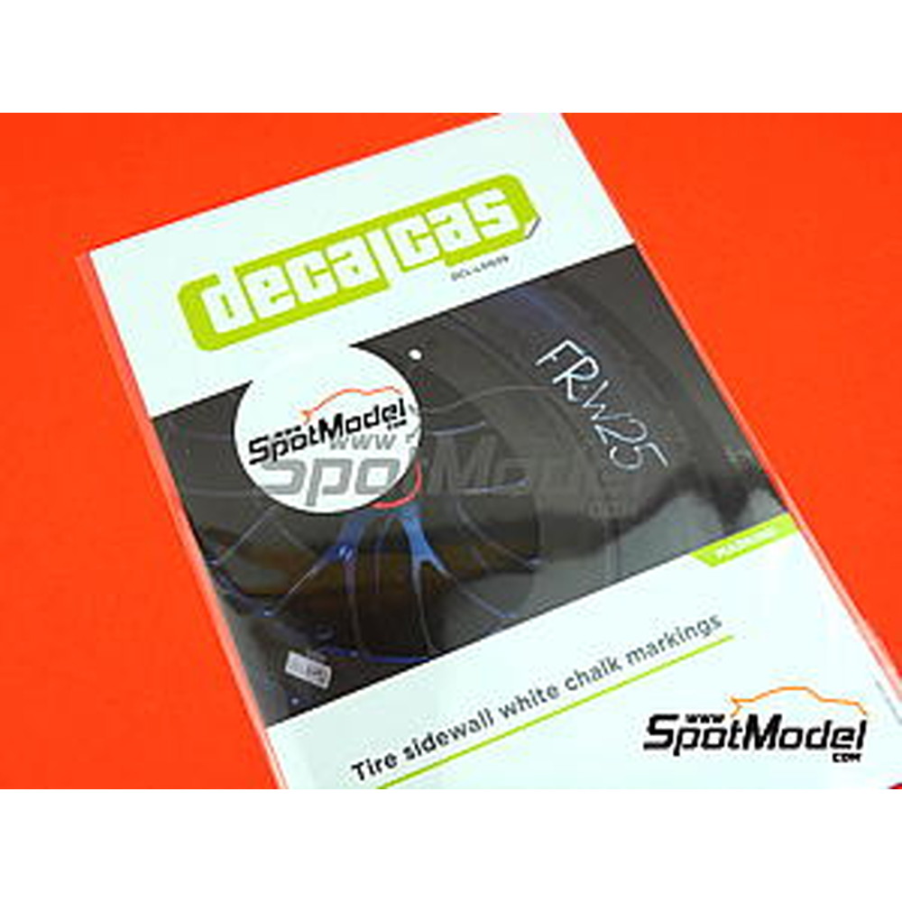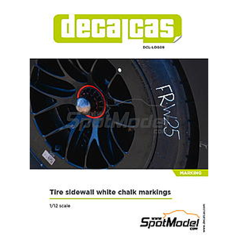 このデカールセットではそうしたレーシングカーのタイヤのサイドウォールに手書きされるサインを再現しています。中でもホワイトのチョークを使ったマーキングをセレクト。数字やアルファベット、あるいはタイヤの回転方向を示す矢印やテスト、プラクティスなど使用タイミングを示す文字など、豊富にセットされています。