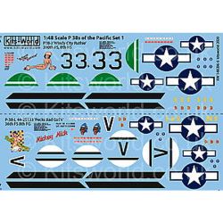第二次大戦でアメリカが配備運用した双発の戦闘機、P-38ライトニングの1/48スケールモデルに対応したデカールのセットです。