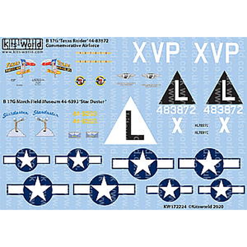 このセットではアメリカのコメモラティブ・エア・フォースミュージアムに保存されているB-17と、同じくアメリカで保存されているマーチ・フィールド・ミュージアムの機体のマーキングを収録しています。