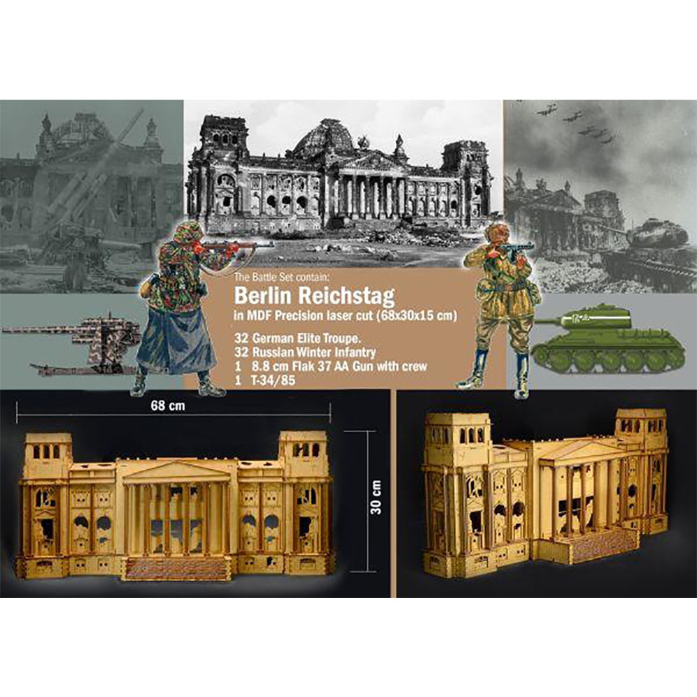 ストラクチャーは木質素材のMDF製。レーザーカット加工済みで最後の攻防を繰り広げたドイツ国会議事堂を再現。力強い姿を仕上がりの左右幅68cm、高さ30cmでモデル化しています。そして、それをめぐる熾烈な攻防戦を繰り広げた両軍兵士も1/72のフィギュアをセット。両軍兵士ともに各32体をモデル化しています。フィギュアはアクション溢れる戦闘中のポージングやユニフォームのディテール、シワなどもシッカリと表現。さらに、ソビエト軍からは侵攻作戦での中心的な戦車となったT-34/85が、迎え撃つドイツ側からはこれを撃破できたであろう8.8cm砲とそのクルーを各1、セットしています。激戦の様子を再現する情景セットです。