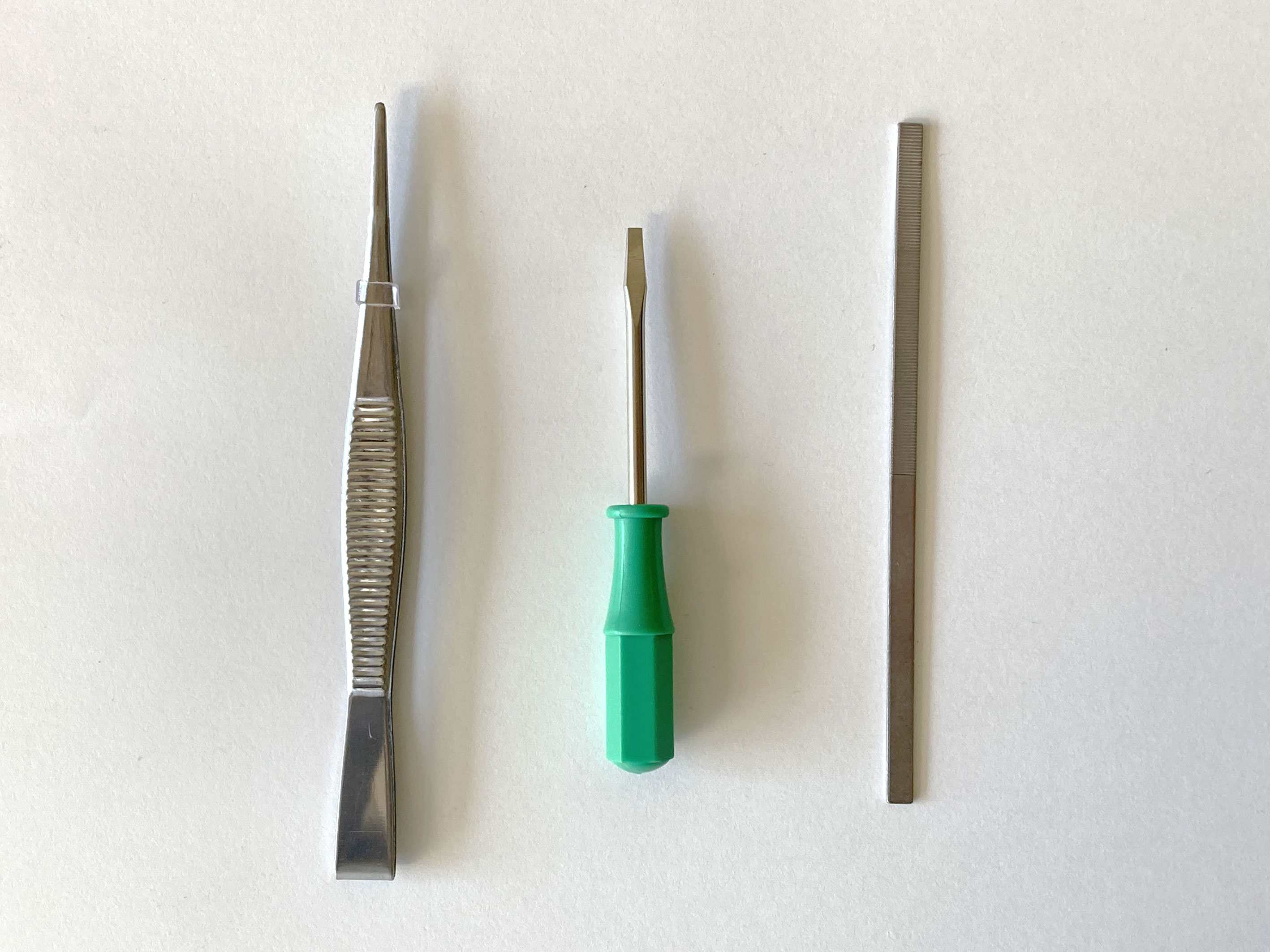 ニッパー、ヤスリ、ドライバー、ピンセットのセットです。