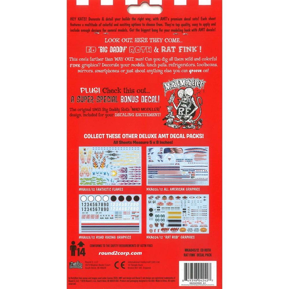 AMTやMPC、ポーラライツなどから各種 タイプがリリースされている1/25カーモデルをカスタマイズして仕上げるのに役立つデカールのセットです。デカールシートには、アメリカのカスタムカーカルチャーを代表するローブロー・アートの第一人者、エド・ロスがデザインしたラット・フィンクという人気のイラストを多数収録しています。