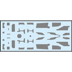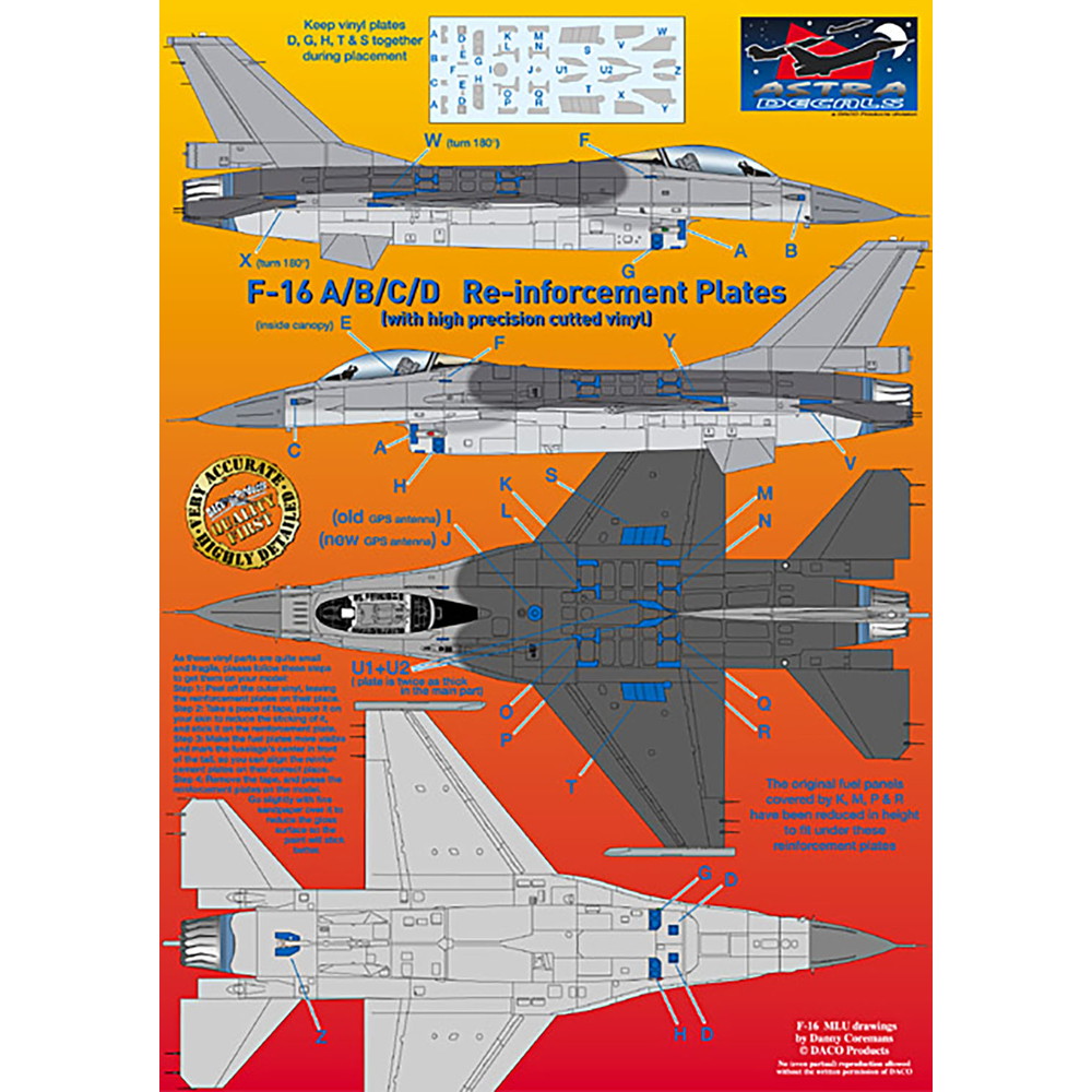 F-16A/B MLUには垂直尾翼の前の部分に特別な形状をした補強プレート が装着されています。加えて、燃料パネルの上にもそうした 補強プレートが装備されています。補強プレートは燃料プレート では実機でその厚さが5.5mmあり、1/72スケールに換算 すれば0.075mmになります。わずかですが厚みがあり、この セットはその微妙な厚みを再現することでリアリティ溢れる 仕上がりを実現します。最高級のプロッターで製造された カットビニールです。