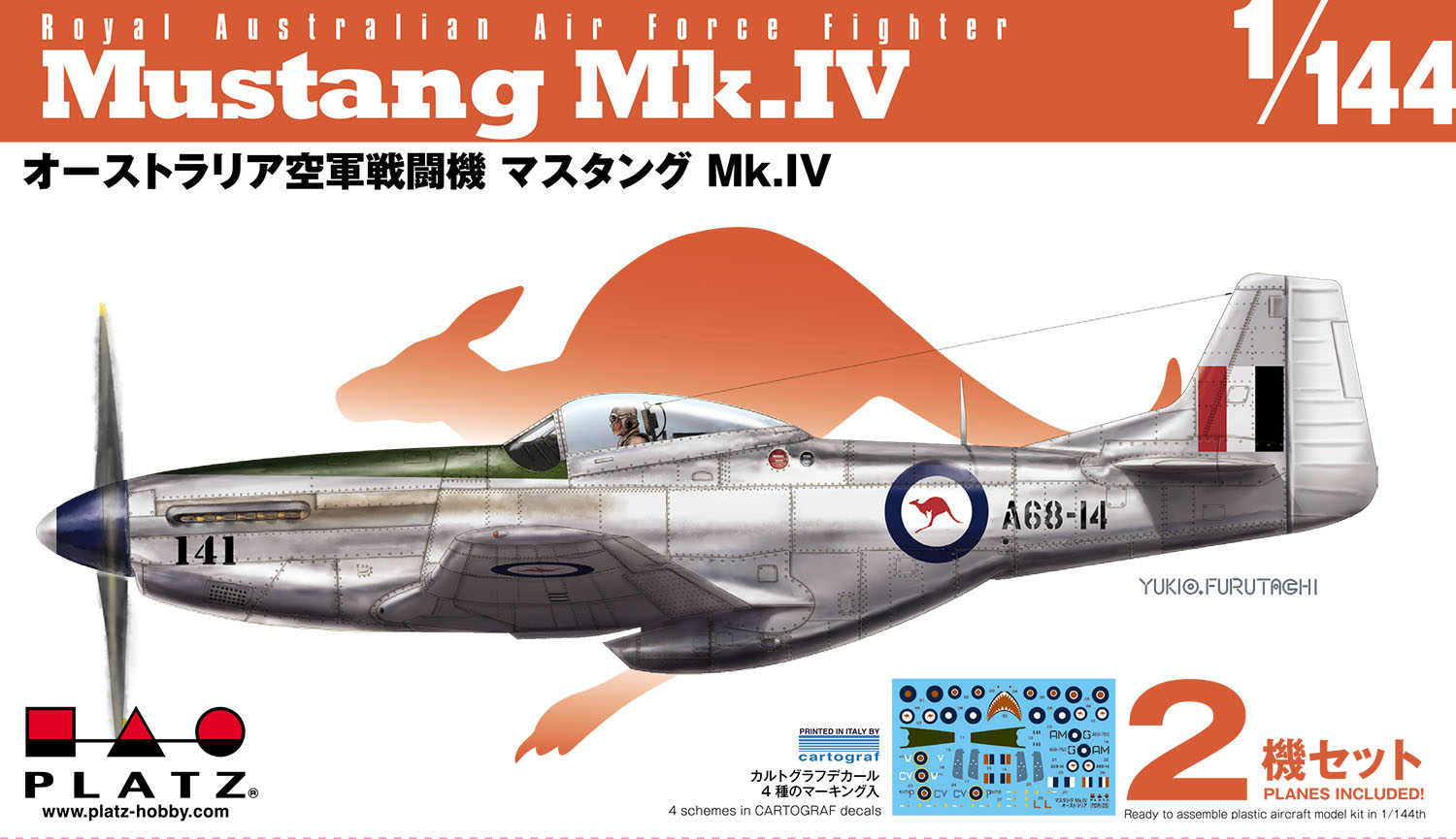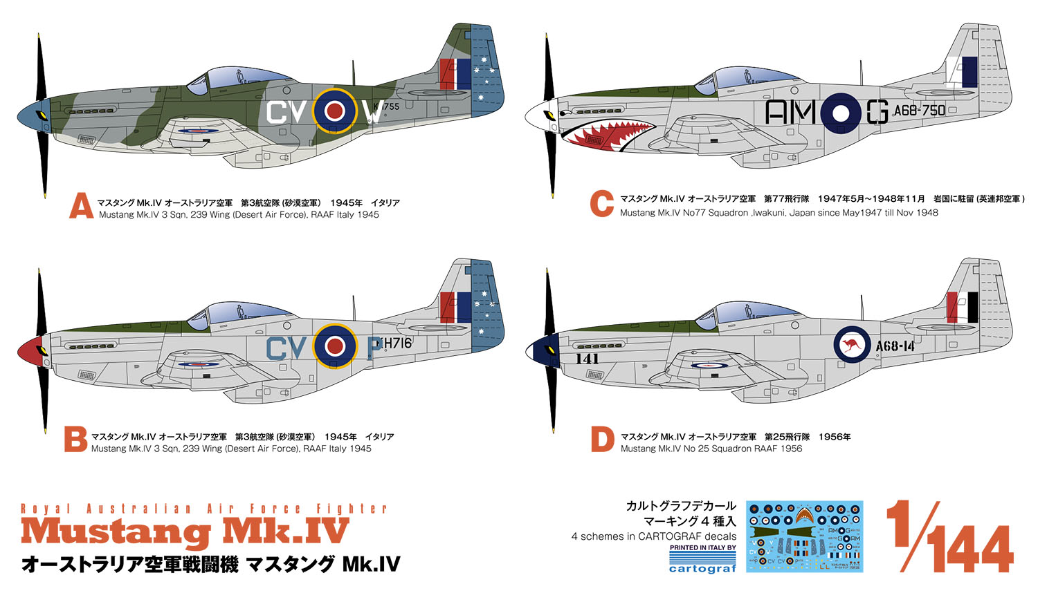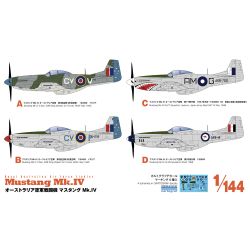 This is a 1/144 scale unpainted plastic model assembly kit for Royal Australian Air Force Fighter Mustang Mk.IV.