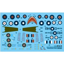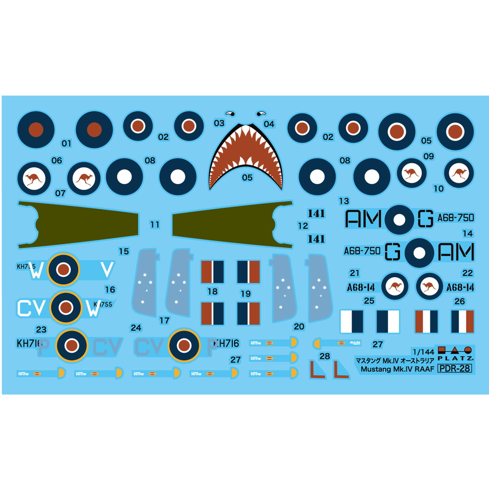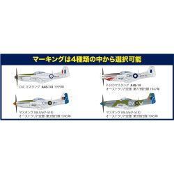 イギリスをはじめとする英連邦諸国ではマスタング Mk.IVと呼ばれたP-51Dですが、 注目すべきはやはりカンガルーの国籍マーク。当初はイギリス空軍と同じマークを 使用していましたが、その後独自のカンガルーマークへと変更。どちらもデカール で用意して、4種のマーキングを楽しんでいただける構成としました。