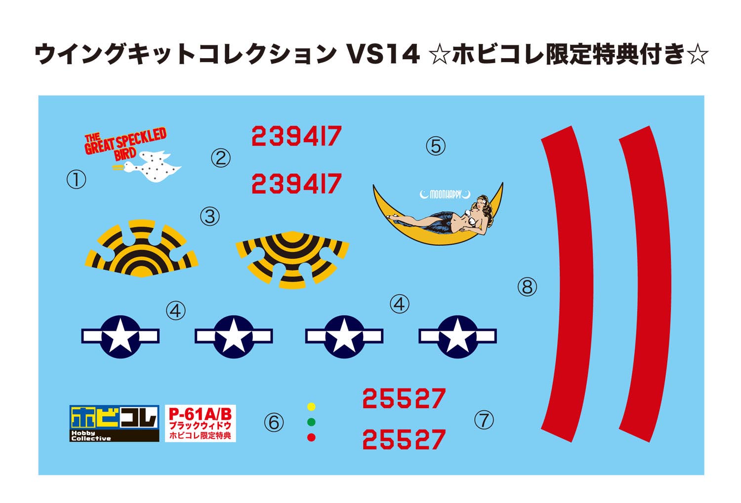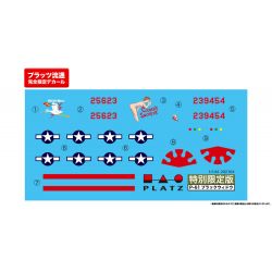 可愛いアヒルのイラストが描かれたノーズアートが楽しい”THE GREAT SPECKLED BIRD”と、スタッフ一押しの”MOON HAPPY”の2種を特典マークとしてご用意。アヒルのマーキングに合わせたブラック塗装の機体1機をセットしています。