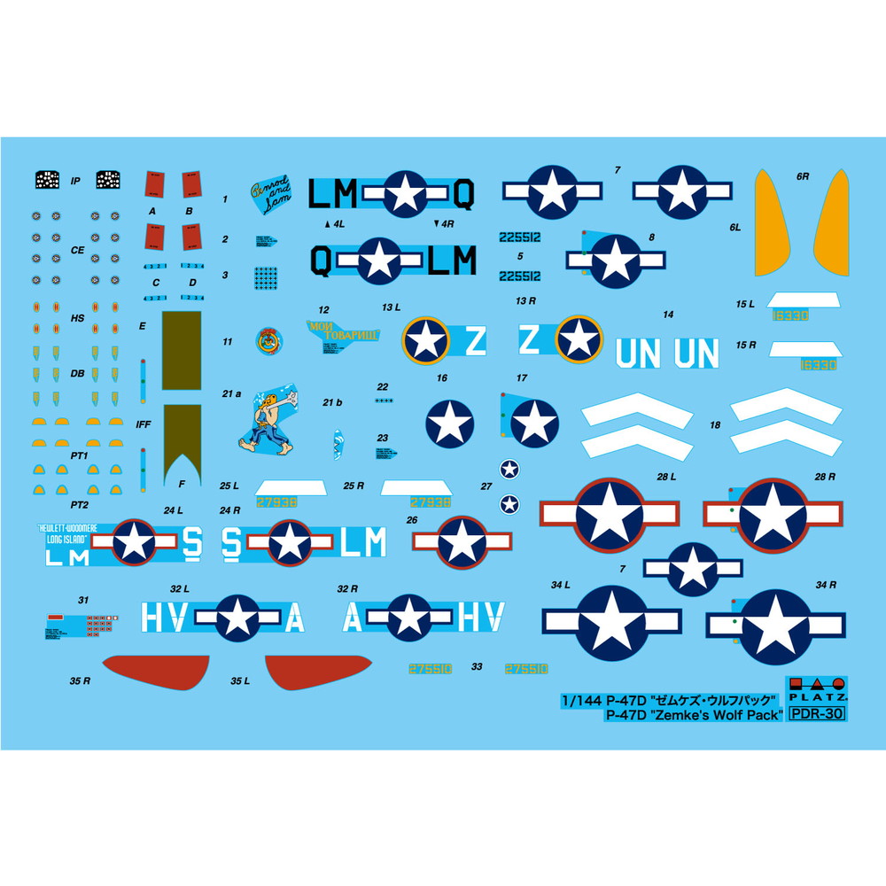 マーキングはアメリカ陸軍航空隊第56戦闘航空群(56FG)の機体か ら4種をセレクト。部隊司令のヒューバート・ゼムケ大佐に率いられた 部隊で、就役当初から終戦まで一貫してP-47を運用。多くのエースパイ ロットを排出したことでも知られています。多くのエースたちは司令の名前 にちなんで”ゼムケズ・ウルフパック”と呼ばれていました。