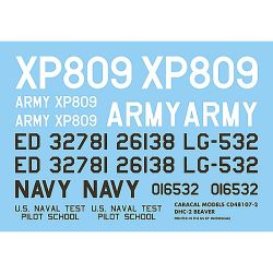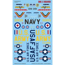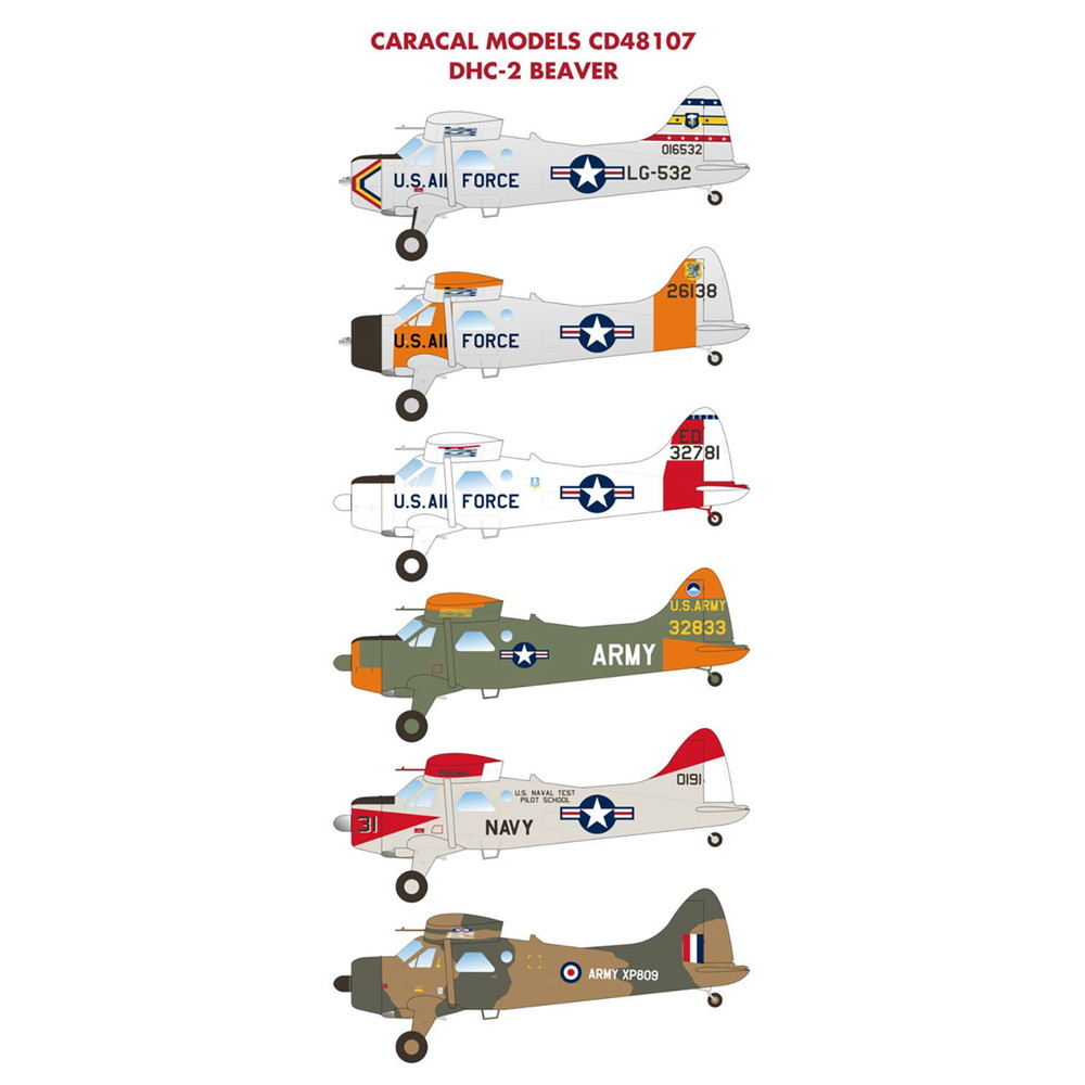 カナダのデ・ハビランド・カナダ社が開発した STOL性能に優れた単発の小型輸送機、デ・ハビ ランド・カナダDHC-2ビーバーのマーキングを 収録しています。世界各国の軍隊で運用され、現在 も民間で活用されています。その中でアメリカや イギリスの軍で使用された機体のマーキングの中 から6種をフィーチャー。バラエティ豊かな機体色 のマーキングが楽しみです。