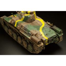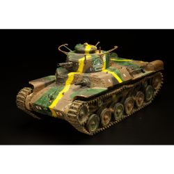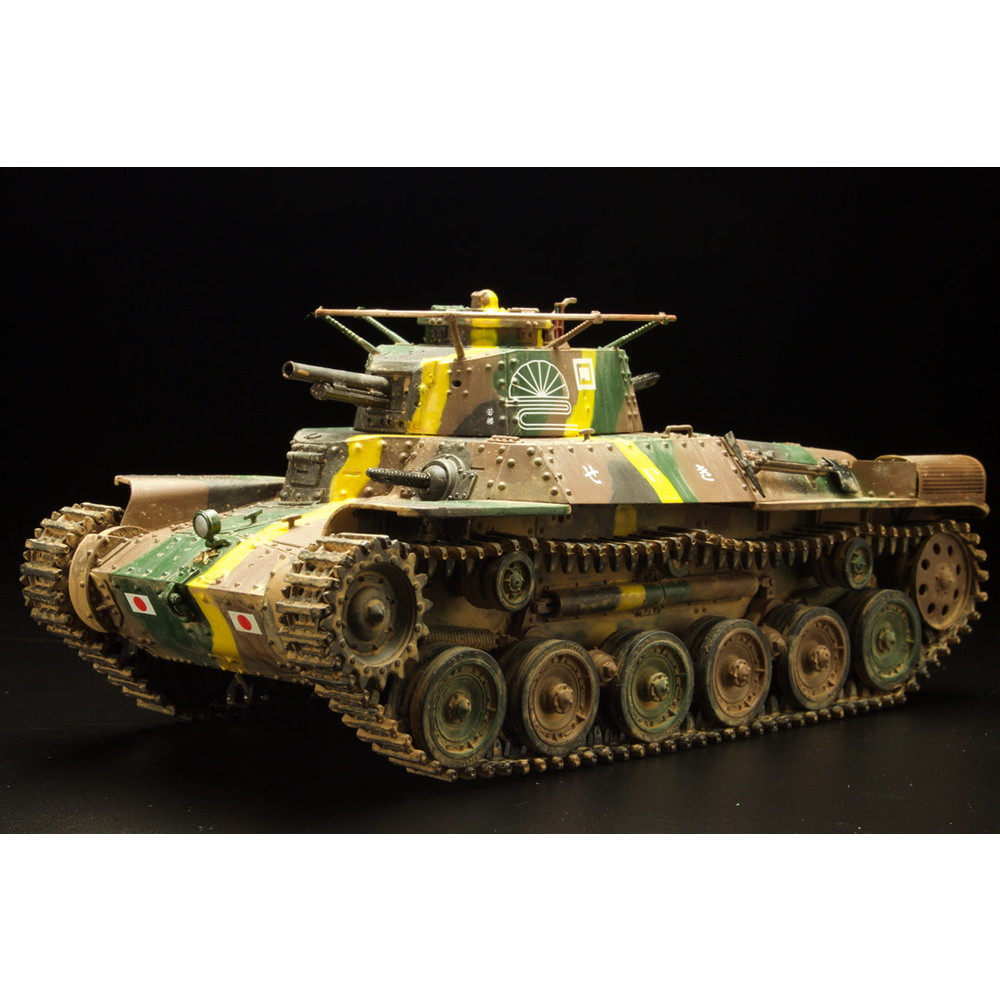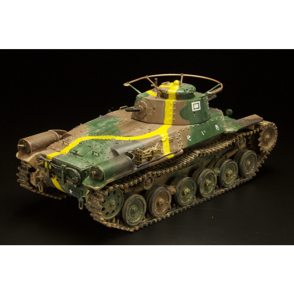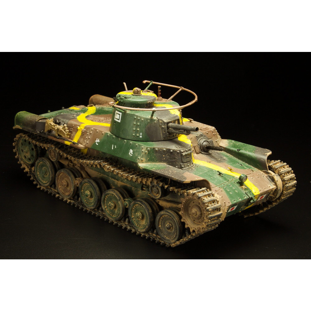 昭和12年(1937年)に完成。低くコンパクトにデザインされた車体形状や左右非対称の形状に鉢巻式アンテナを 装備した砲塔、エンジンには空冷のディーゼルエンジンを搭載し、足回りには特徴あるシーソー式サスペン ションを採用するなど、独自のメカニズムが盛り込まれた戦車でした。