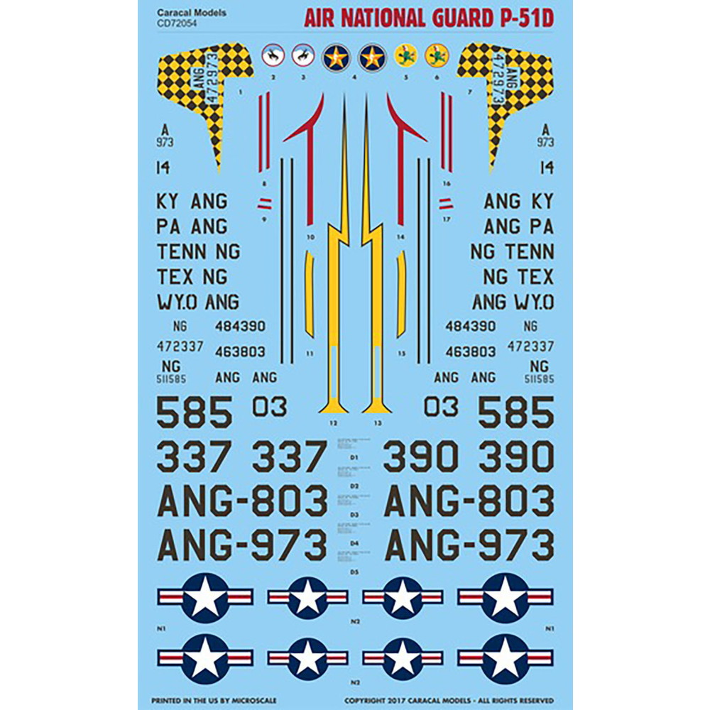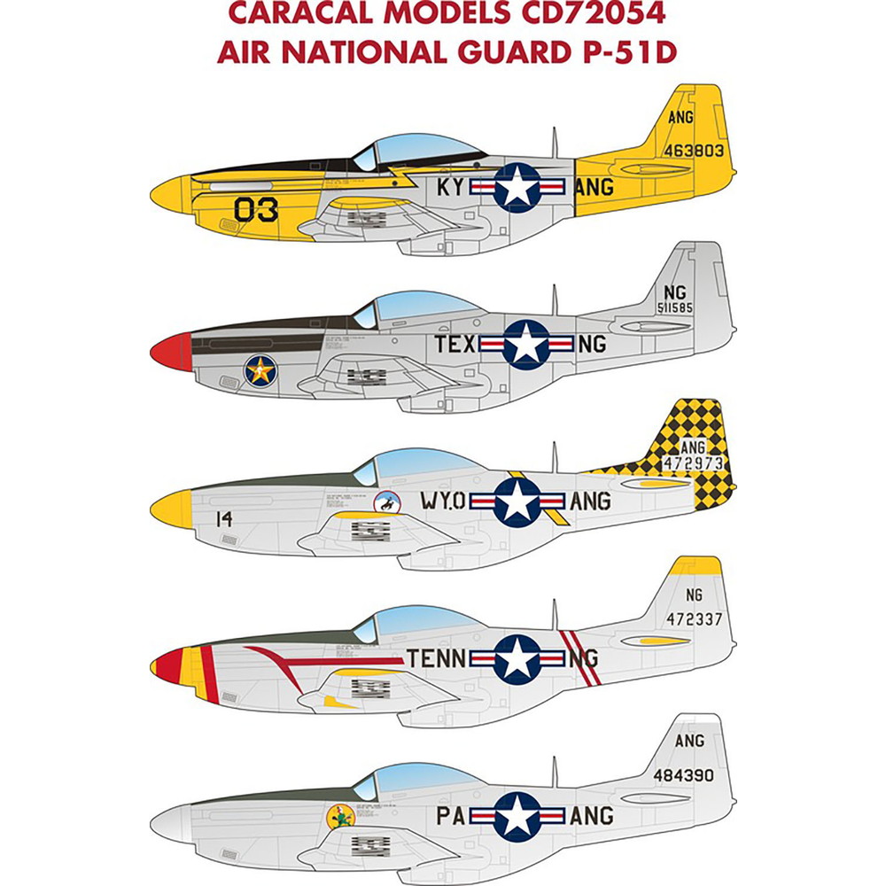 このセットは第二次大戦の傑作機として知られる アメリカのP-51Dマスタングのマーキングを収録 しています。第二次大戦中にアメリカ軍で大量に運用 されていますがこのデカールではケンタッキー州や テキサス州、ワイオミング州、ペンシルベニア州、 テネシー州の各州空軍が配備、運用した機体のマー キングからセレクトしています。個性的でカラフル なマーキングが楽しめるデカールシートです。各州の 州空軍機から1機づつ、計5種の機体のマーキングを収録 しています。ステンシル類は1機分をセット。