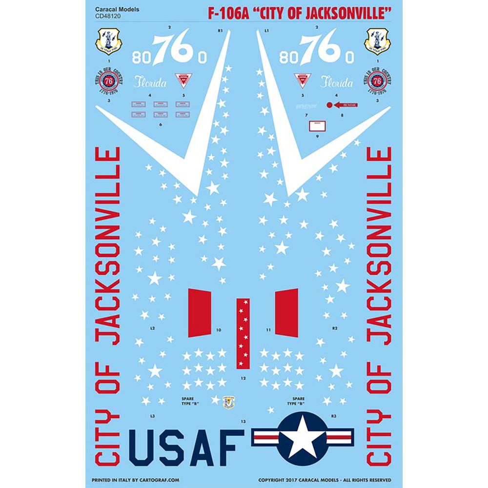 このセットは1976年に建国200年を迎えたアメリカ で数多く登場したスペシャルマーキングを施した 機体の中でも最もカラフルと言われて人気を集めた F-106Aデルタダートのマーキングを再現します。