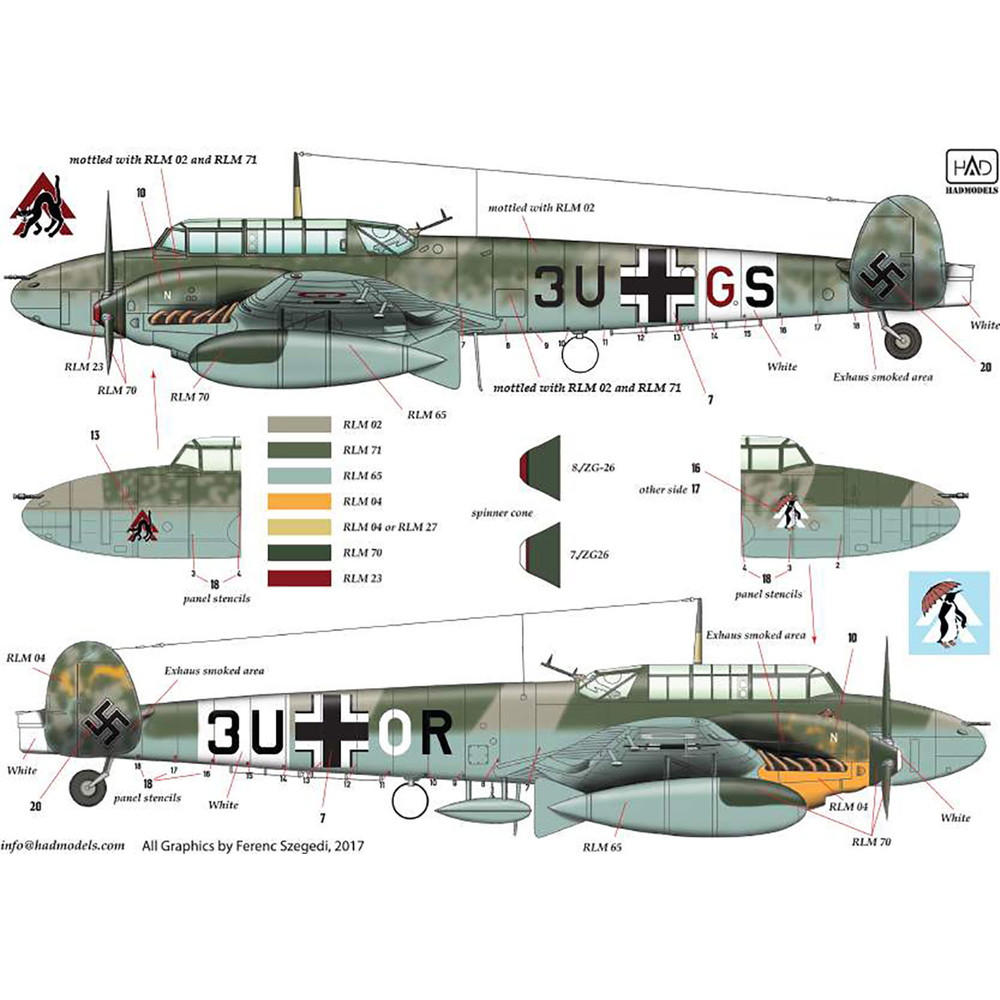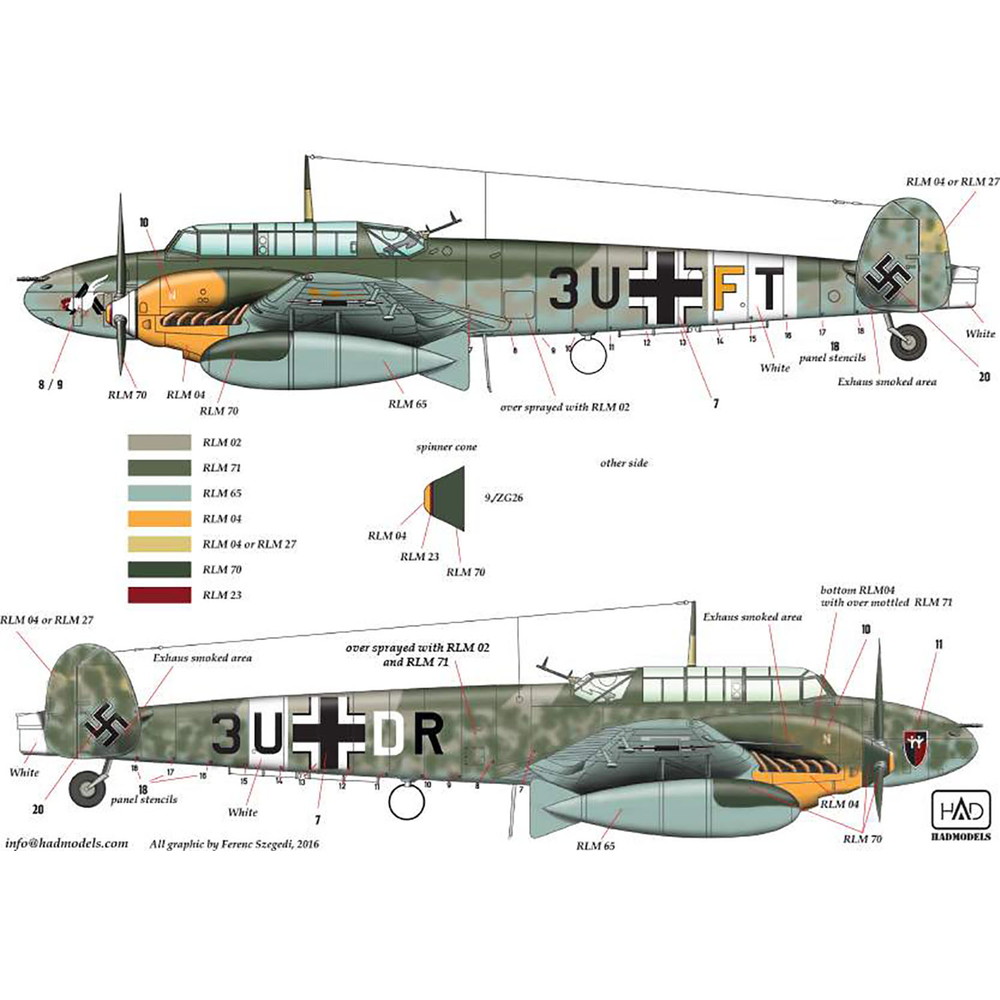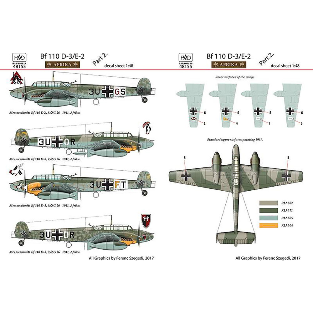 第二次大戦におけるアフリカ戦線で活躍した ドイツ軍のメッサーシュミットBf110のマーキング を4種類収録しています。