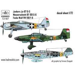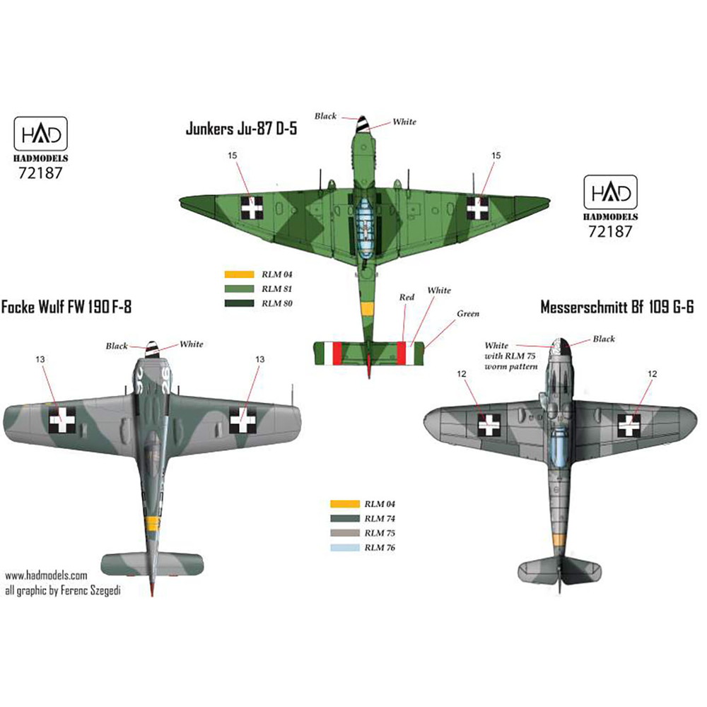 1/72スケールのフォッケウルフFw190F-8、メッサーシュミットBf109G-9、ユンカースJu-87D-5の各モデルに対応したデカールのセットです。