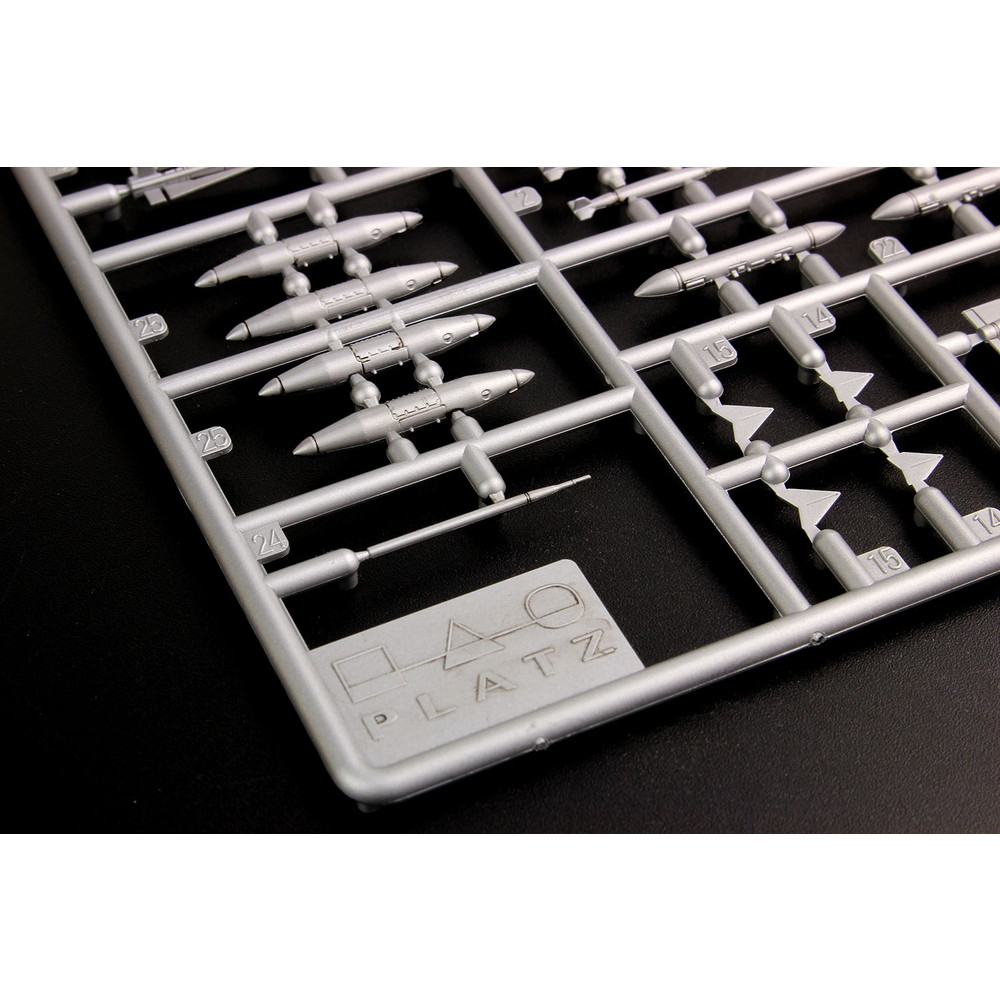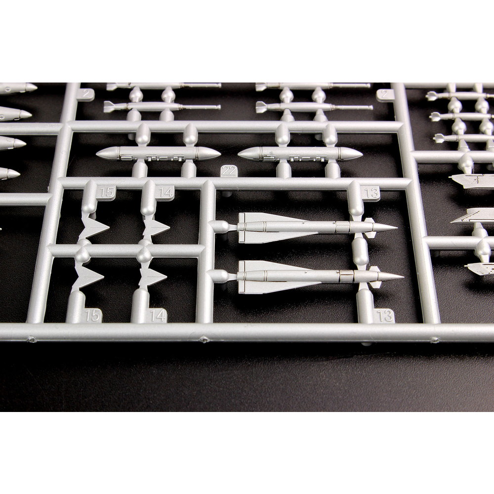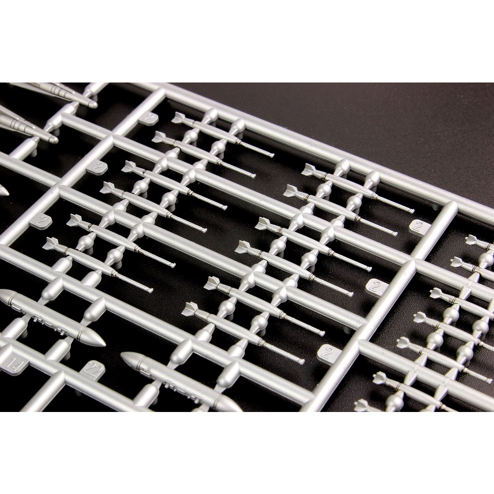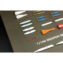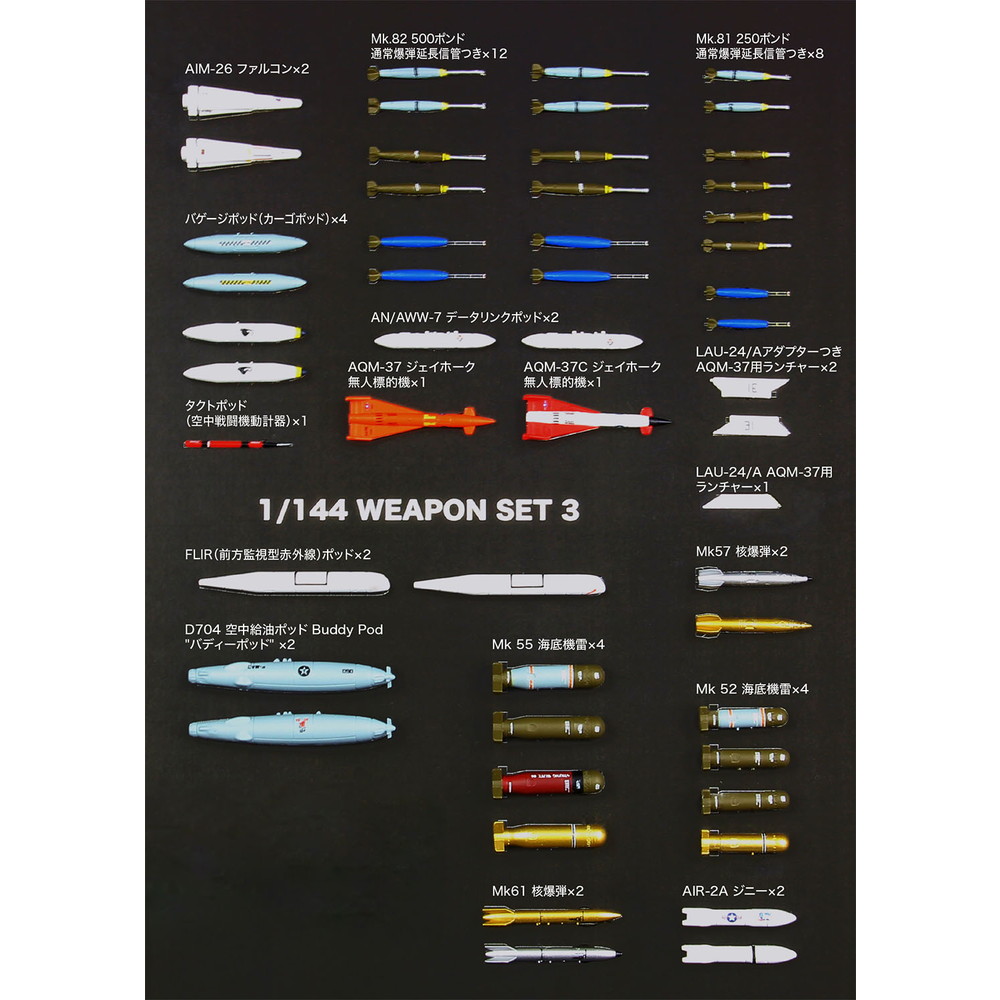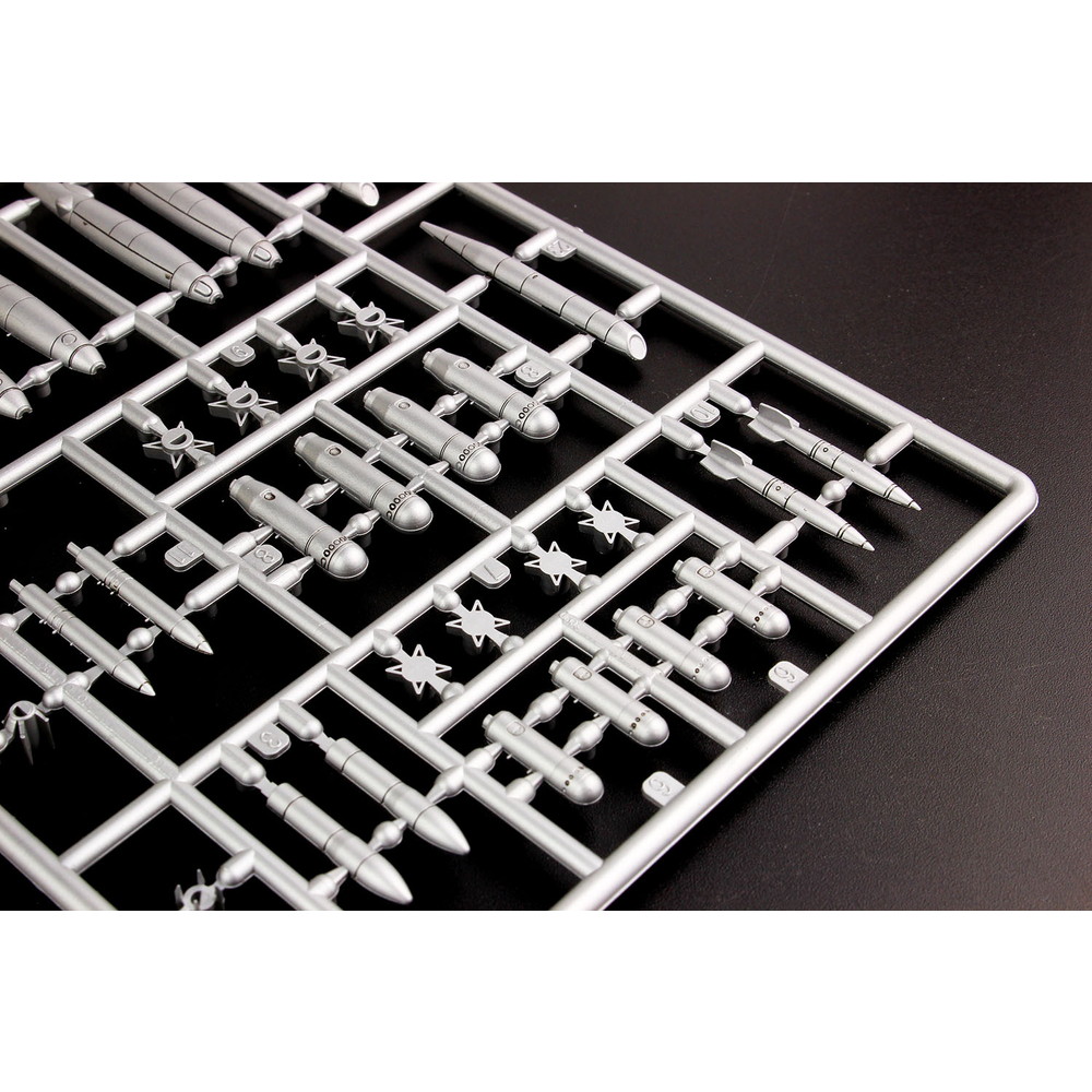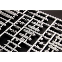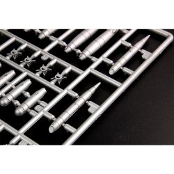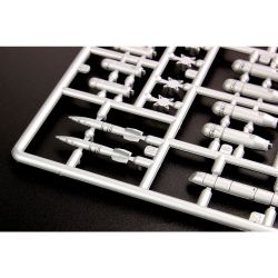A total of 17 types of weapons such as missiles for current aircraft that is suitable for 1/144 scale airplane model kit.■In this set, the U.S. air-launched supersonic target drone, AQM-37 Jayhawk and its launcher, the air-to-air missile AIM-26 Falcon, as well as Mk57 and Mk61 missile, AN/AWW-7 Data Link Pod, others like baggage pod, and FLIR pod.