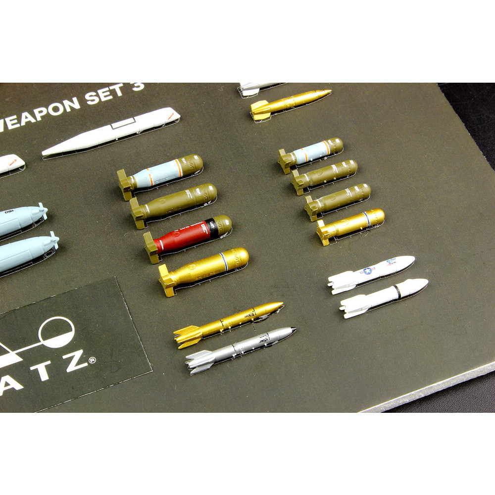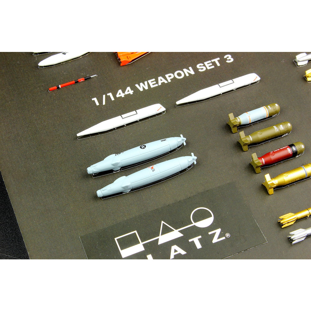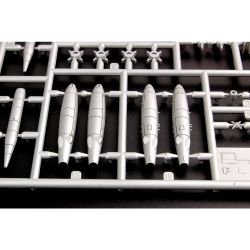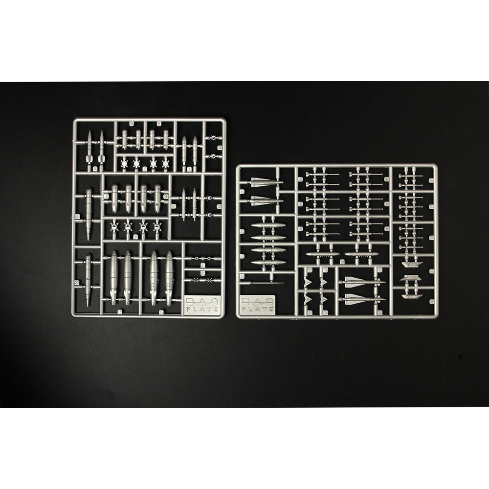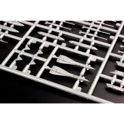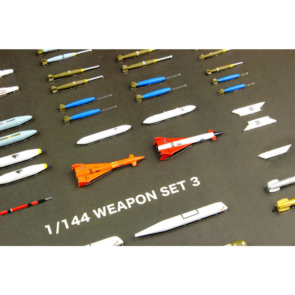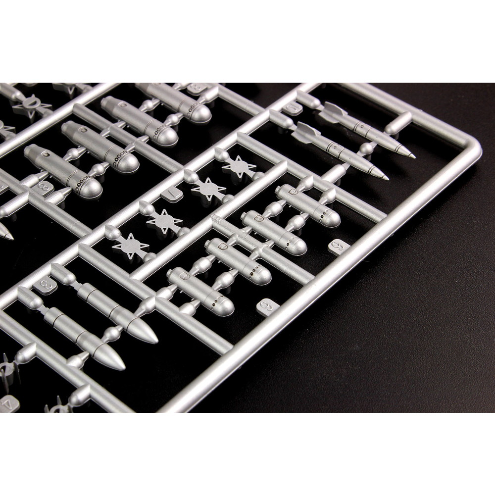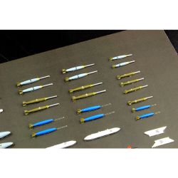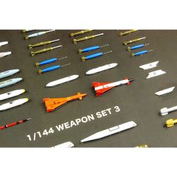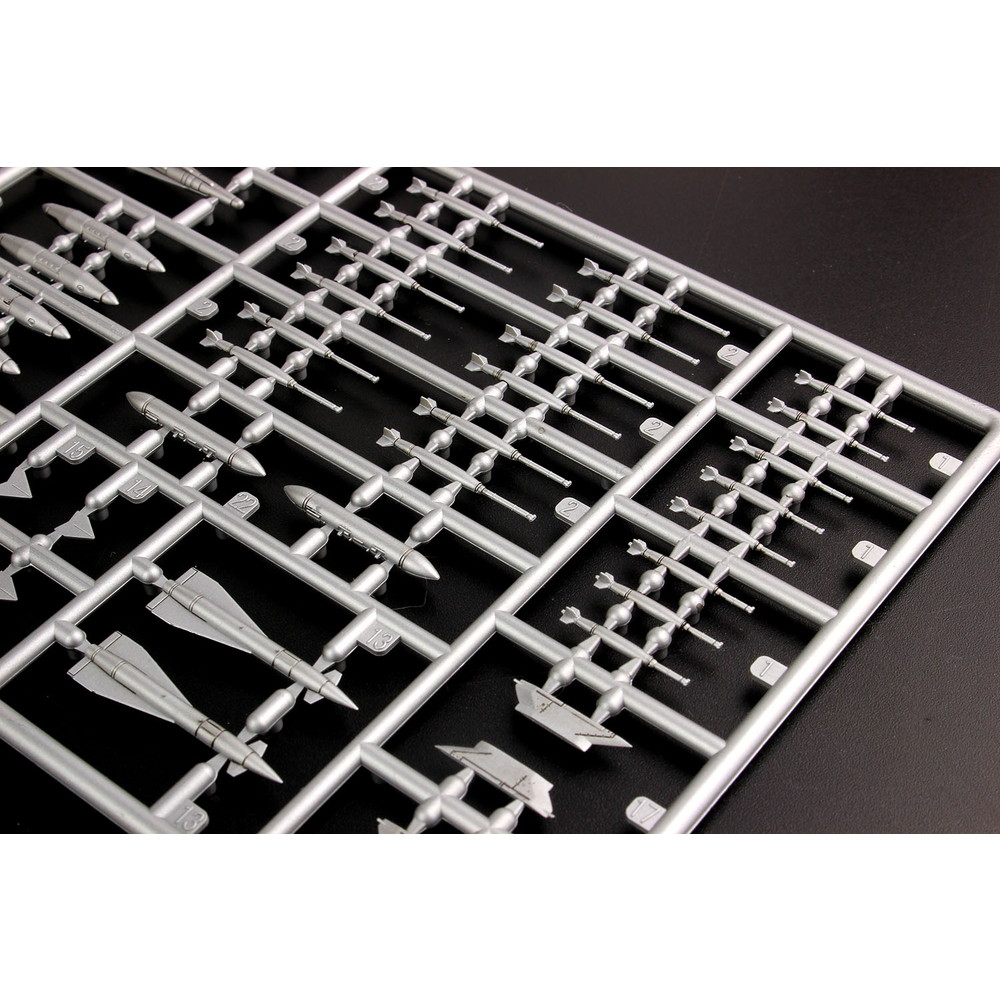 A total of 17 types of weapons such as missiles for current aircraft that is suitable for 1/144 scale airplane model kit.■In this set, the U.S. air-launched supersonic target drone, AQM-37 Jayhawk and its launcher, the air-to-air missile AIM-26 Falcon, as well as Mk57 and Mk61 missile, AN/AWW-7 Data Link Pod, others like baggage pod, and FLIR pod.