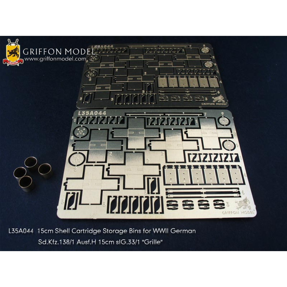 オープントップ戦闘室に太い15cm重歩兵砲を搭載した独特なスタイルがモデルでも魅力のグリレH型を再現したドラゴンのキットをさらにディテールアップ。セットにはオープントップの戦闘室内にセットされる薬莢カートリッジを収納する扉付きのケースを再現するパーツが用意されています。カートリッジがひとつ収まる箱を6個縦に積み上げる収納ケースは扉のパーツが別パーツで開閉を選択して組み立て可能。中に納まるカートリッジも4つ分のパーツが用意されていますから、扉を開けた状態で組み立てたケースに入れておくのも良いでしょう。