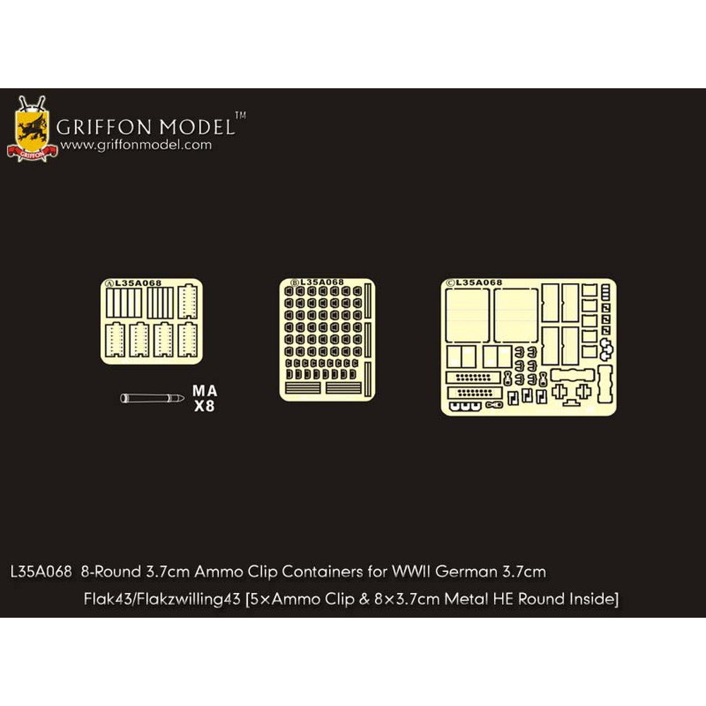セットは第二次大戦でドイツ軍が使用した高射機関砲、3.7cm高射機関砲Flak43の給弾用砲弾クリップとそのクリップを収納するコンテナを再現するパーツを収録しています。クリップパーツは8発の砲弾を装填できるタイプを再現。5個のクリップを組み立てられます。また、クリップコンテナは各2個を作ることができるパーツを収録。外観のディテールはもちろん、留め具、ヒンジに加えて、内部の仕切りなどの細部もシャープに再現しています。さらにこのキットには砲弾8発もセット。アクセサリーパーツとして1/35スケールの各メーカーのキットと組み合わせて使用すれば情景製作の幅も広がります。