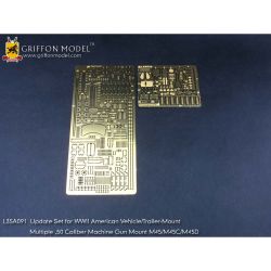 第二次大戦でアメリカ軍の対空機関銃、4連装キャリバー50はM16のように車両に搭載されたり、専用のトレーラーに搭載され、戦中から戦後にかけてその高い威力を発揮しています。ドラゴンの各キットでもキャリバー50の4連装がモデル化されていますがこのセットにはそれらのディテールをアップデートするエッチングパーツが用意されています。装甲扉のヒンジや歩兵用プラットホームパーツ、弾倉サポートブラケットパーツやバッテリーハイドロボックスなどのディテールを高める細かなパーツを満載。エッチングならではのシャープさがキットのプラスチックパーツとは違う仕上がりを演出。M16自走砲の各タイプをはじめ、M17自走砲、さらに、M51、M55ガントレーラー、そして、M35シリーズのガントラックなどの各キットに利用していただけます。