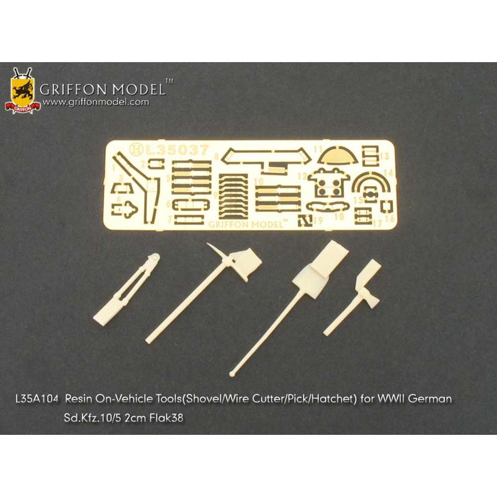 ドイツ軍が第二次大戦で使用した1トンハーフトラックのバリエーションタイプ、Sd.Kfz.10/5 2cmFlak38対空砲搭載型の車両に搭載された車載工具をレジンパーツとエッチングパーツでを再現。ドラゴン、サイバーホビーからモデル化されている1/35スケールのSd.Kfz.10/5のキットに使用することができます。レジンパーツで再現された工具はワイヤーカッター、スコップ、斧、つるはしの4点。レジンならではの繊細な表現がリアリティを高めます。くわえて、これらの工具を装備するフェンダーへの固定用ブラケットパーツ類を柄チングパーツで用意。モデルの仕上がりをシャープに演出します。