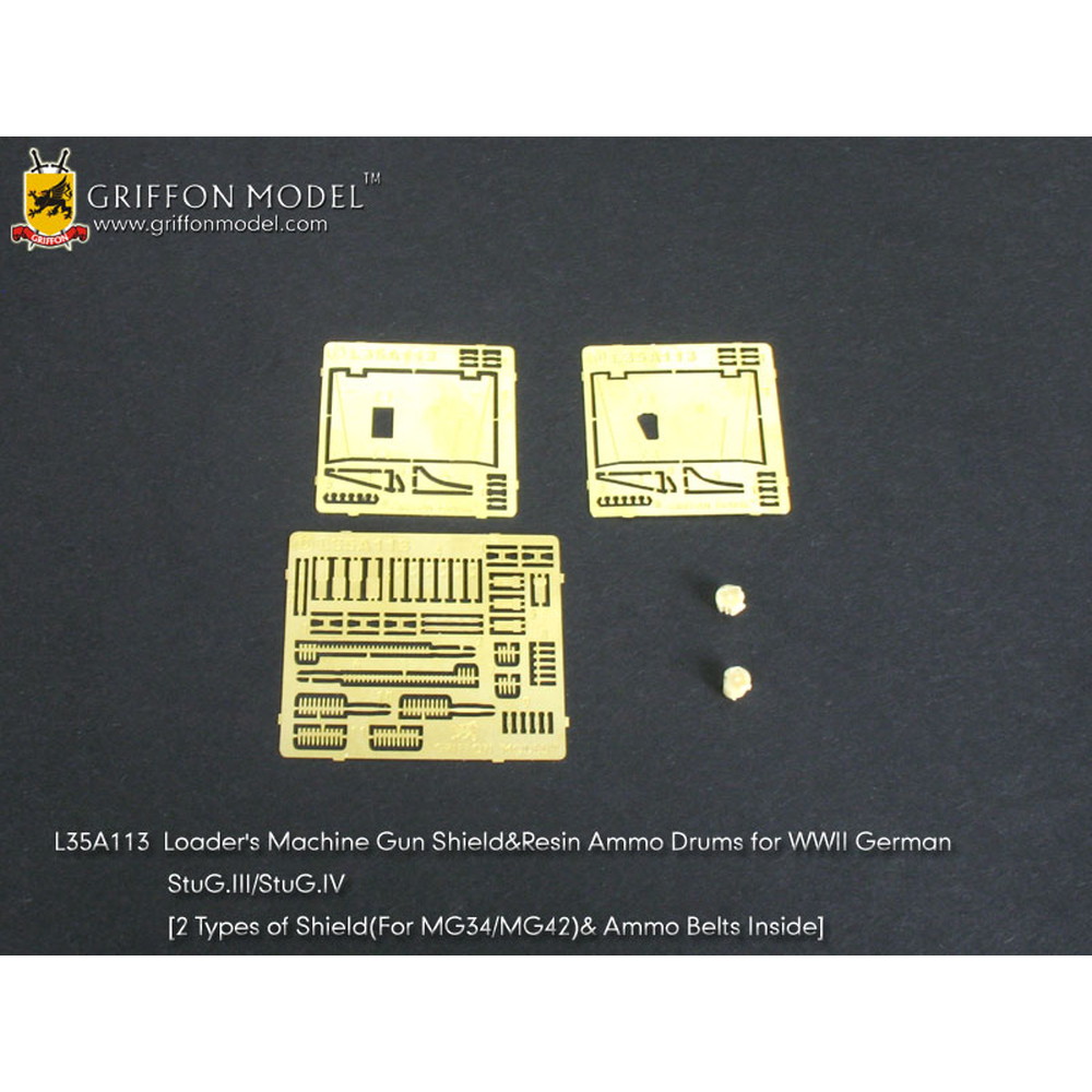 セットには第二次大戦でIII号戦車とIV号戦車の車体を利用して開発されたIII号突撃砲のG型とIV号突撃砲を再現したドラゴン/サイバーホビーの各キットに使用できるローダーズハッチのマシンガンシールド用エッチングパーツが入っています。シールドは機銃を通す開口部の形状が異なる2種類をセット。選んで組み立て可能です。さらに、弾帯パーツのほかレジン製のドラム弾倉もセット。