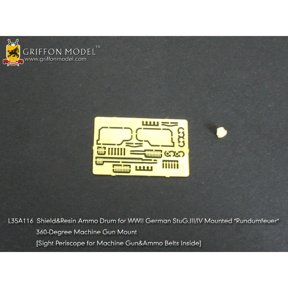 セットには第二次大戦でIII号戦車とIV号戦車の車体を利用して開発されたIII号突撃砲とIV号突撃砲を再現したドラゴン/サイバーホビーの各キットに使用できる戦闘室上部に取り付けられた機関銃の防弾板、シールドを再現するパーツが入っています。ローダーズハッチの前方に取り付けられる機関銃用のシールドパーツでこのセットのパーツは旋回式機関銃用のシールドをモデル化。くわえて、MG34/42機関銃用のドラム弾倉のレジンパーツもセット。キットのパーツのかわりに取り付けることでシャープな仕上がりを演出。