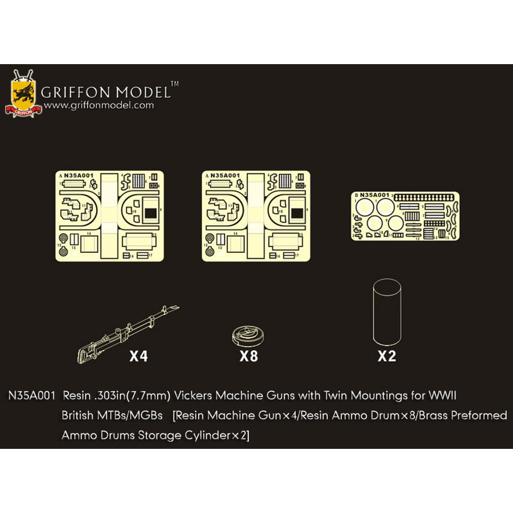 第二次大戦でイギリス軍が運用した高速魚雷艇ボスパーは時速70キロの最高速を誇る魚雷艇で大西洋を中心にノルマンディ上陸作戦でも活躍しました。このセットは魚雷艇に装備された7.7mmヴィッカース機関銃のレジンパーツと2連装銃架や銃架マウントパーツをエッチングパーツでセット。機関銃は4丁、2連装2基分を収録。さらに、魚雷発射管をまたぐマウントパーツもモデル化されています。また、円盤状のドラム弾倉を再現したレジンパーツ8個とそれを収納する弾倉収納ケースの金属パイプパーツ2本も用意。