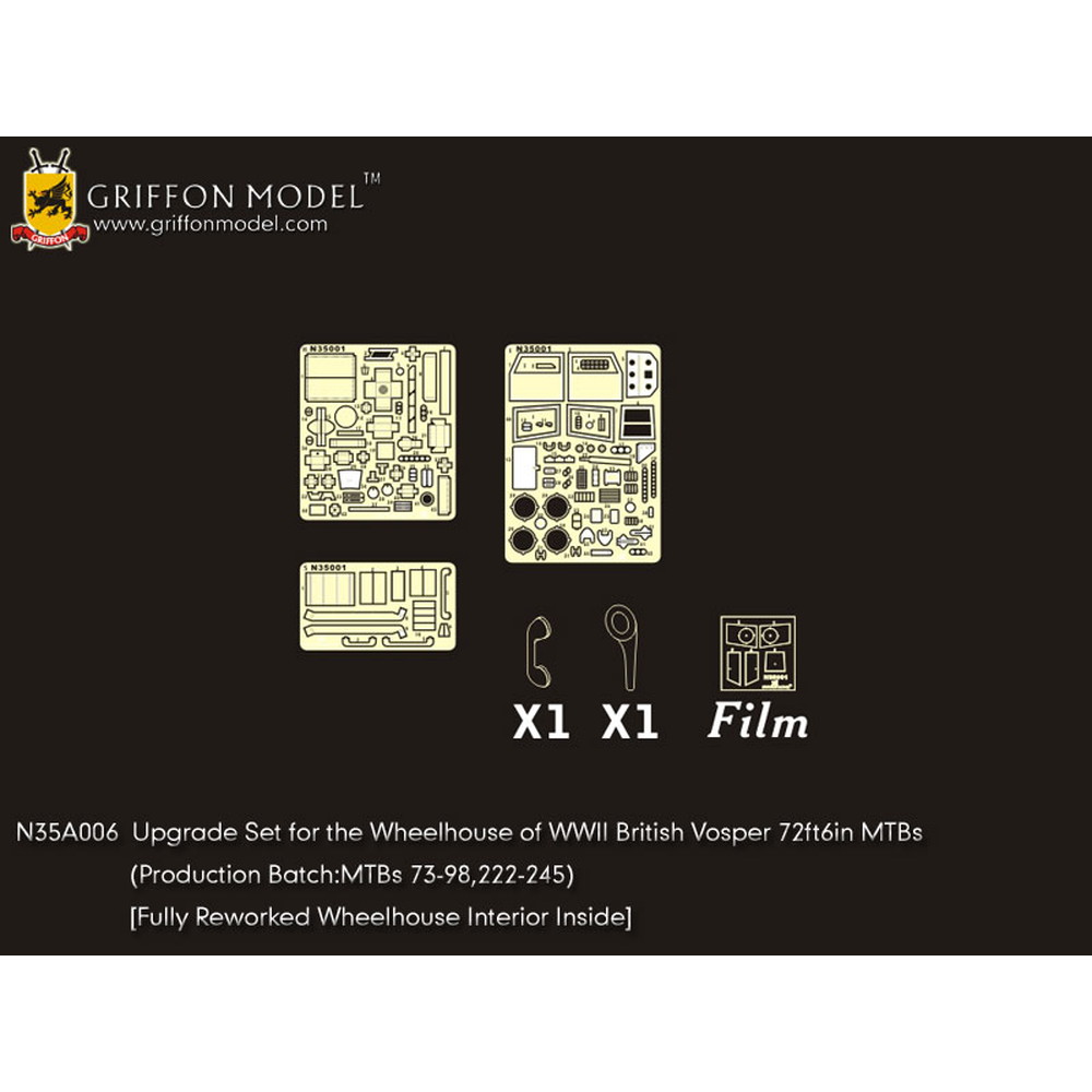 第二次大戦でイギリス軍が運用した高速魚雷艇ボスパーは時速70キロの最高速を誇る魚雷艇で大西洋を中心に活躍しました。このセットは高速魚雷艇ボスパーの操舵室部分をディテールアップするエッチングパーツをセット。この艦艇はオープンブリッジとクローズドブリッジの両方を備えていますが、クローズとブリッジの操舵室内部を再現する計器パネルや窓の内張り、スピーカーやハシゴなどを用意。さらに、伝声菅マウスピースや電話の受話器もレジンパーツで再現しました。