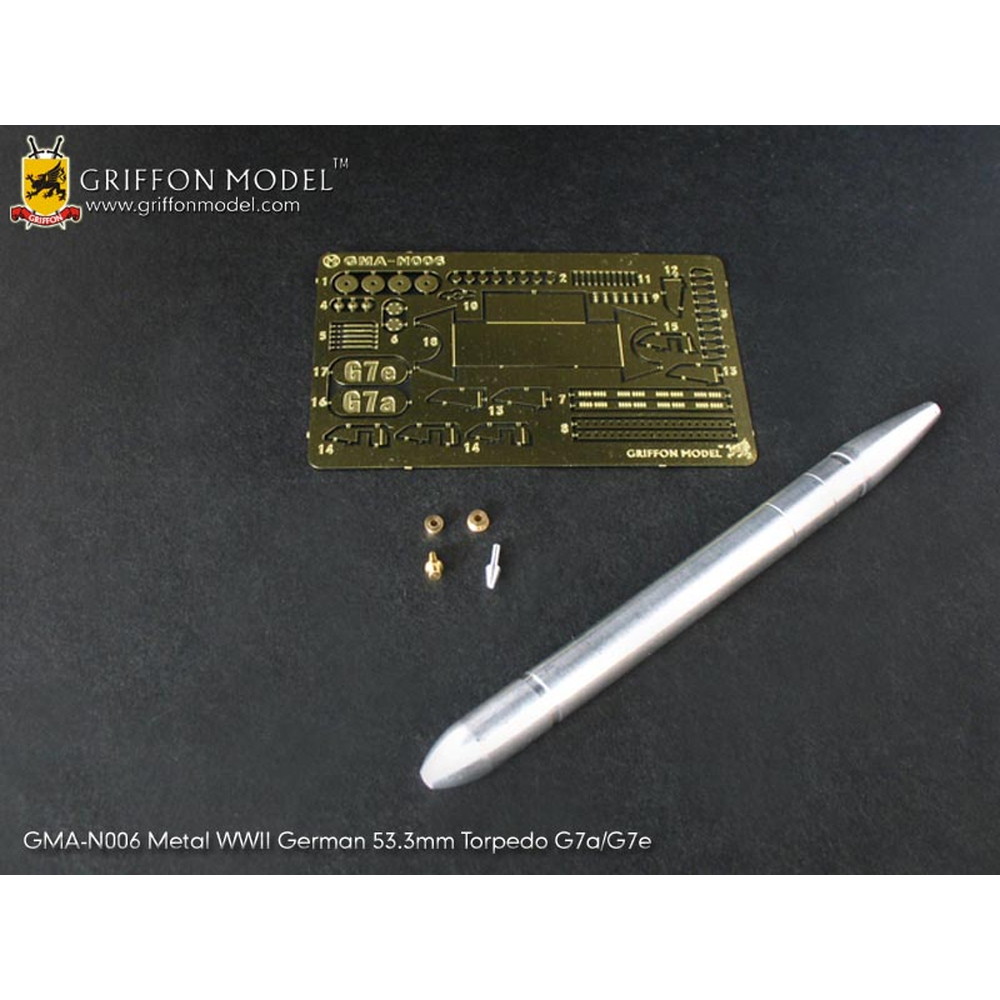 第二次大戦でドイツ軍が潜水艦、Uボートや高速戦闘艇などで使用した魚雷がG7魚雷です。著系が533mmで全長は7メートル以上ありました。蒸気エンジンシステムを採用したG7aと電気推進方式のG7eがあり、連合軍艦船を数多く沈めています。このセットでは1/72スケールでG7魚雷を再現。本体部分は金属パーツでスクリューやフィンなどをエッチングパーツで再現します。本体の直径は約7mm、長さは約9cm。スムーズな形状をリアルに表現。エッチングパーツには組み立て後の魚雷の展示台も用意されています。