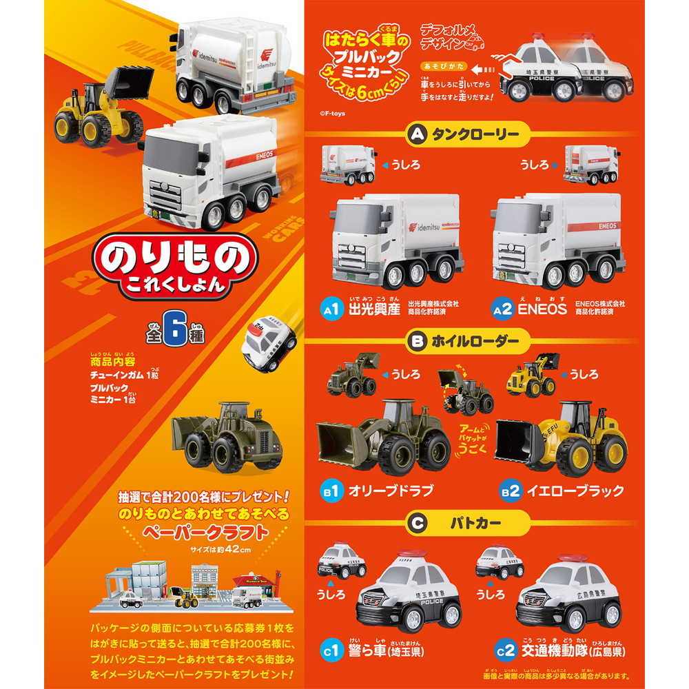 パッケージの側面についている応募券1枚をはがきに貼って送ると、抽選で 合計200名様に、プルバックミニカーとあわせてあそべる街並みをイメージしたペーパークラフトをプレゼント!