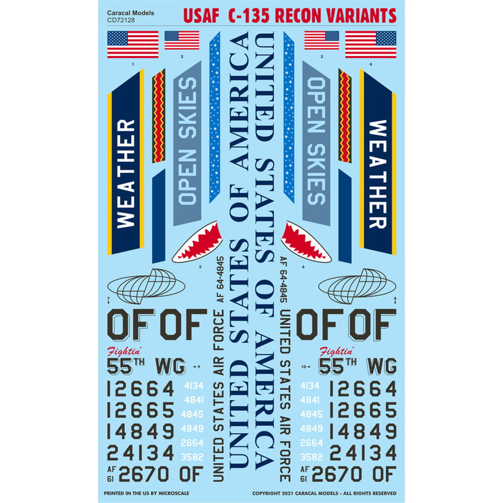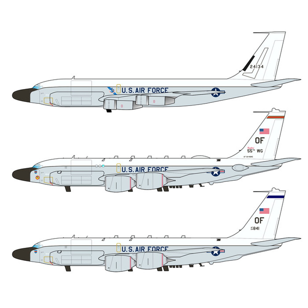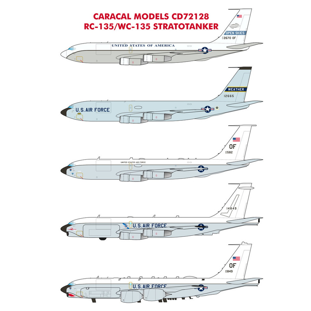 このセットはアメリカ空軍が配備、運用した空中給油機、KC-135のバリエーションタイプのひとつ、偵察機型のマーキングを収録しています。冷戦中からそれ以降の様々な時期に活躍した機体の中から9つの機体のマーキングをセレクト。
